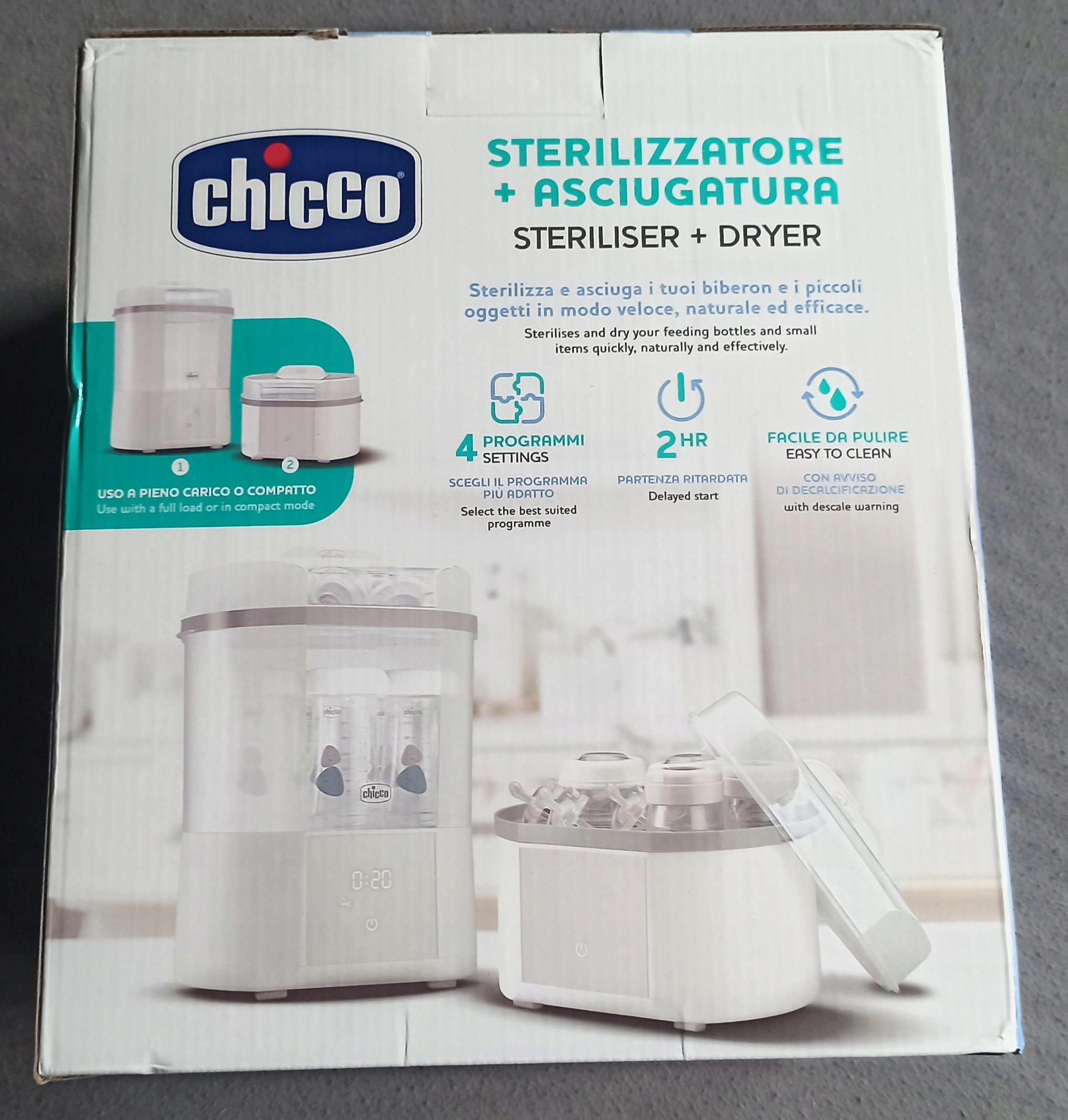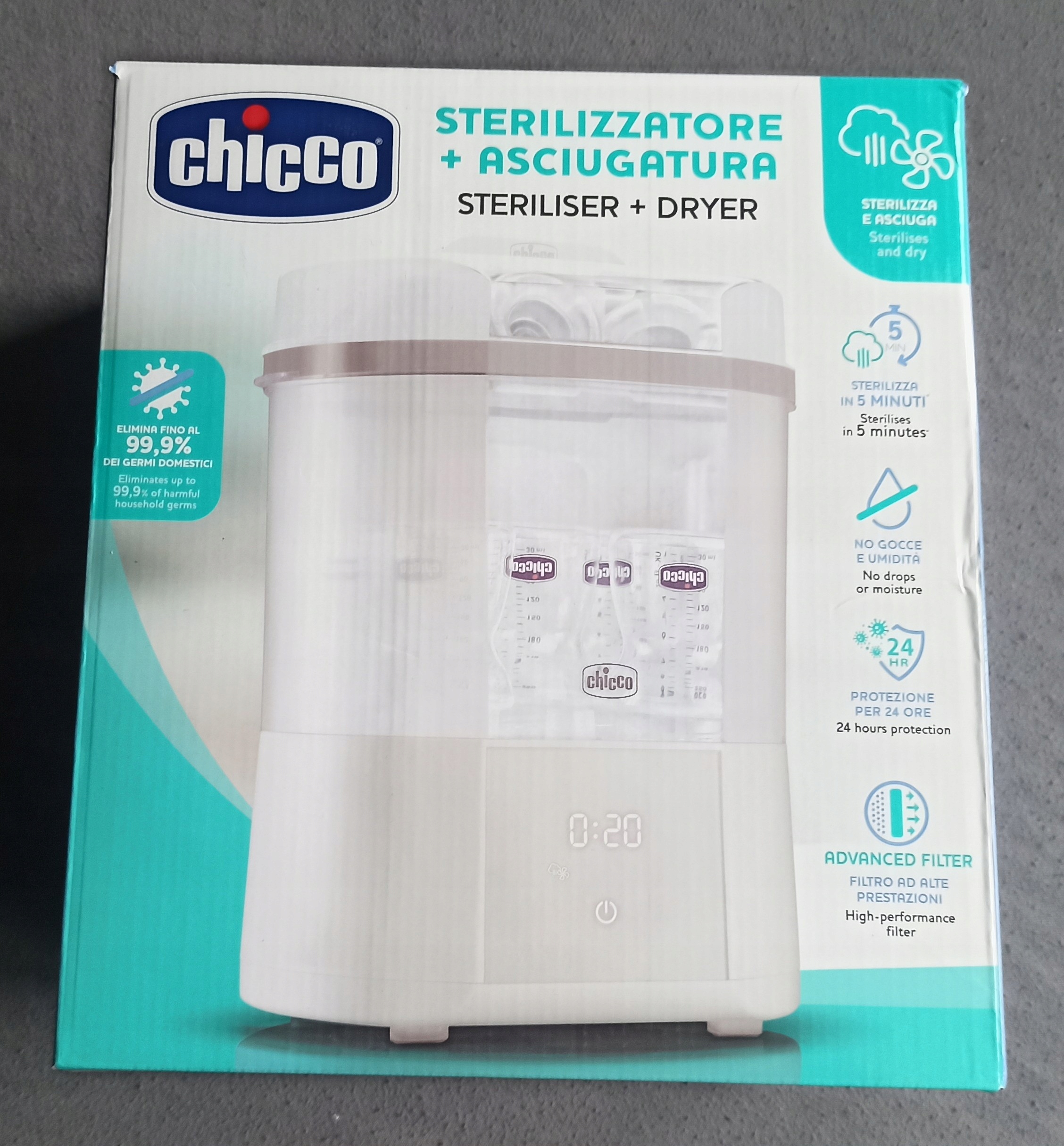 Модульний стерилізатор Chicco з функцією сушіння стерилізує пляшечки, молоковідсмоктувачі та пустушки всього за 5 хвилин (без часу на розігрів) за допомогою природної пари. Стерилізація парою знищує 99,9% побутових мікробів без хімічних добавок. Він не залишає запаху чи смаку на стерилізованих предметах і не потребує полоскання. Стерилізатор має три модульні настройки для налаштування розміру предметів, що стерилізуються. У повнорозмірному режимі можна стерилізувати до 6 пляшок по 330 мл; в компактному режимі до 2 пляшечок по 330 мл, 1 молоковідсмоктувач або соска; Режим мікрохвиль ідеально підходить для мікрохвильової стерилізації. Стерилізатор також має індикатор видалення накипу. Стерилізатор не вимагає постійного контролю, тому що він автоматично вимикається в кінці циклу. Предмети залишаються дезінфікованими протягом 24 годин після закриття кришки. Стерилізатор сумісний з більшістю стандартних пляшечок, молоковідсмоктувачів і аксесуарів. Він займає мало місця, а ніжний колір підходить для будь-якої кухні.