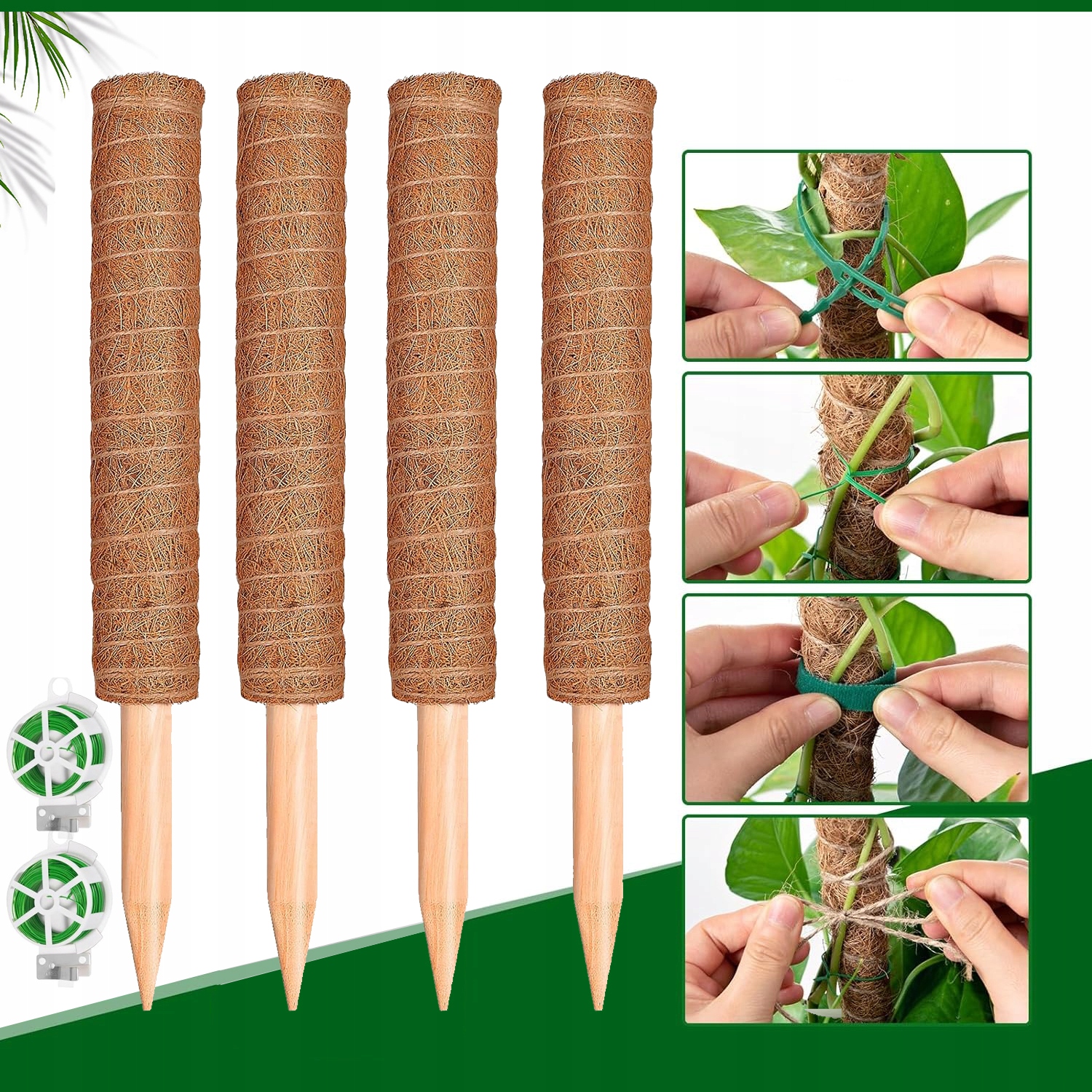 🪴 Комплектація: у набір входять 4 мохові жердини по 40 см, 2 рулони зеленого зв'язувального дроту. Мохові кілки підходять для невеликих і середніх альпіністів, таких як монстера, гібіскус, кріп, грошова трава та інші кімнатні та зовнішні рослини.