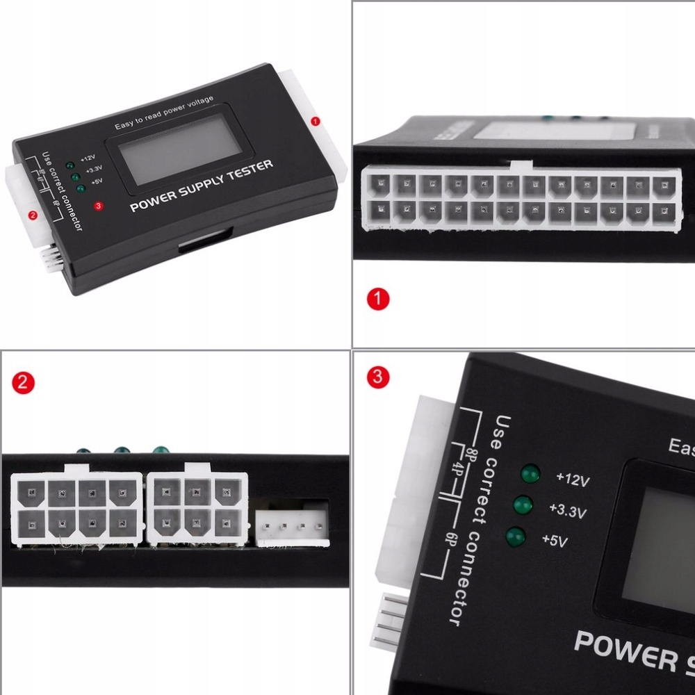 Тестер оснащений діодами, що показують напругу +12В, +5В, +3,3В.