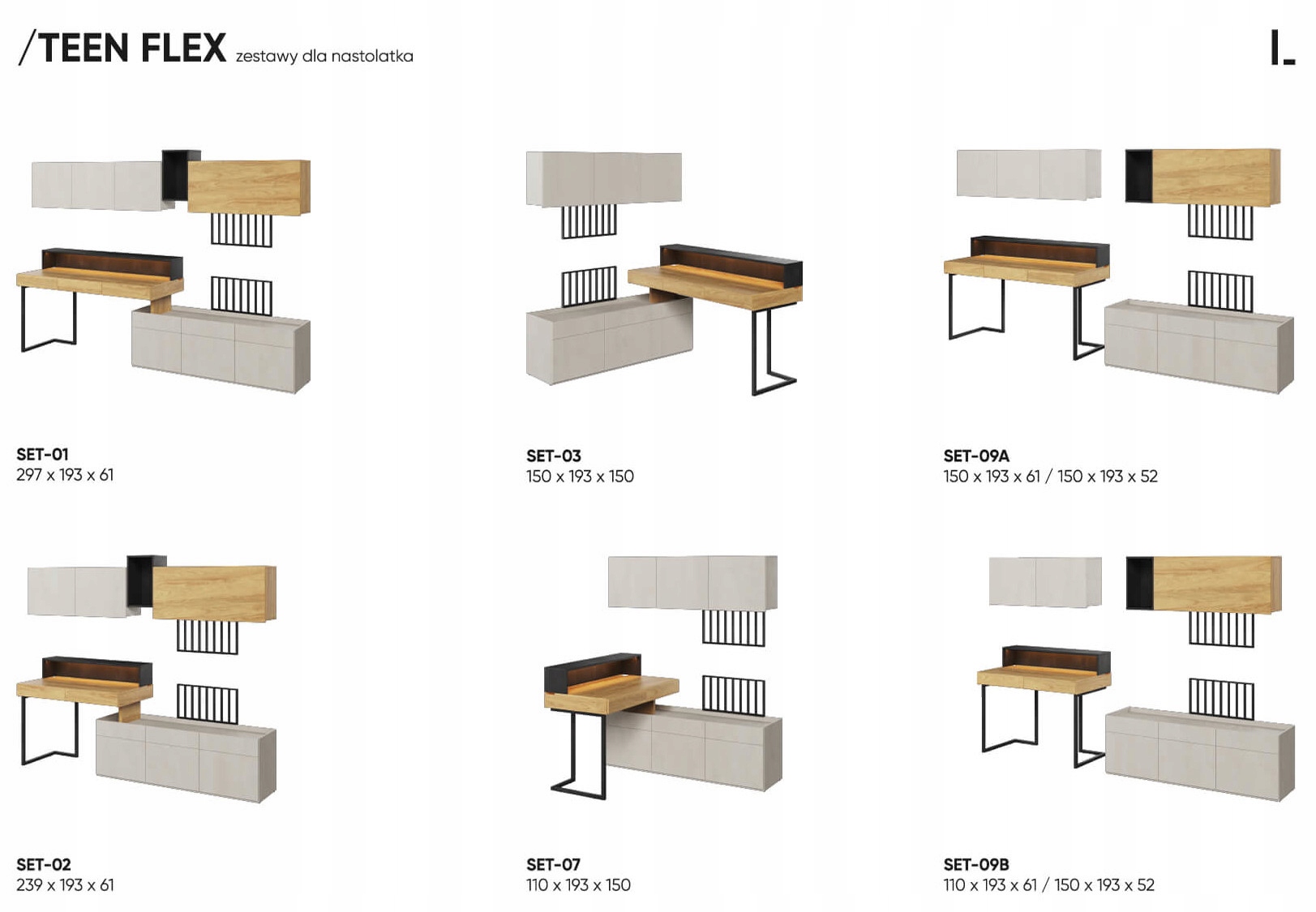 Меблі TEEN FLEX були створені з думкою про зростання дитини. Функціональні рішення в сучасному, не перебільшеному вигляді в поєднанні зі стриманими кольорами дозволили створити універсальну колекцію. Він сподобається як дівчатам, так і хлопцям. Турбуючись про підлітків, які живуть в одній кімнаті, дизайнери підготували готові набори, які допоможуть батькам створити продумане розташування. Багата пропозиція включає вісімнадцять блоків, дванадцять готових наборів і два напівліжка CONCEPT JUNIOR.