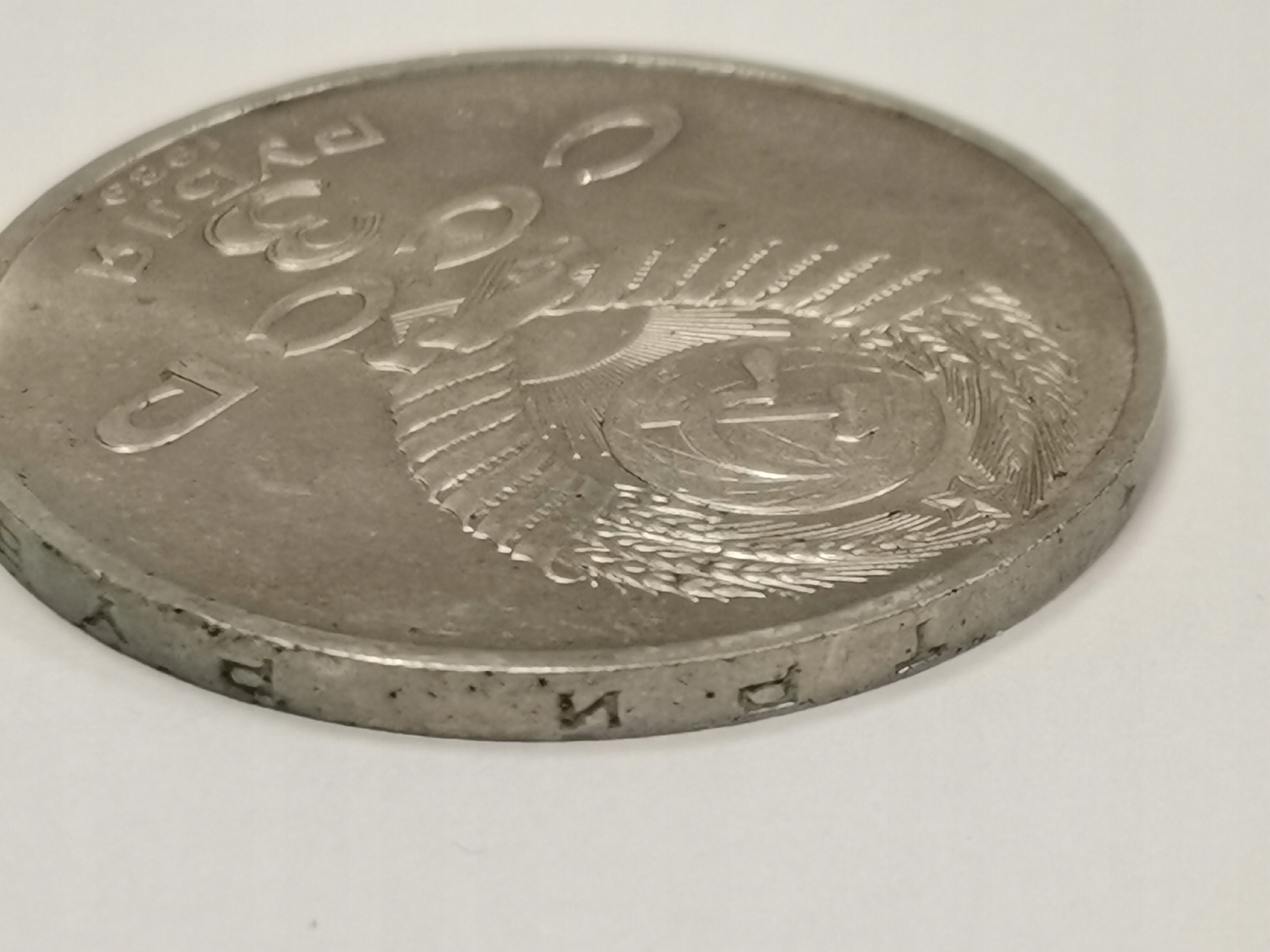 - Напис на краю: 'ПЯТЬ РУБЛЕЙ ⋆ ПЯТЬ РУБЛЕЙ ⋆' (п'ять рублів п'ять рублів)