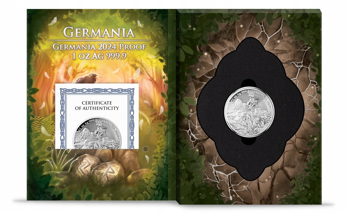 Перспектива аверсу Germania 2024 знову розширюється з кожною монетою в колекції. - 1, 2, 10 унцій і 1 кг. Однак у цьогорічному випуску є ще одне нововведення – на аверсі змінено окремі елементи дизайну.