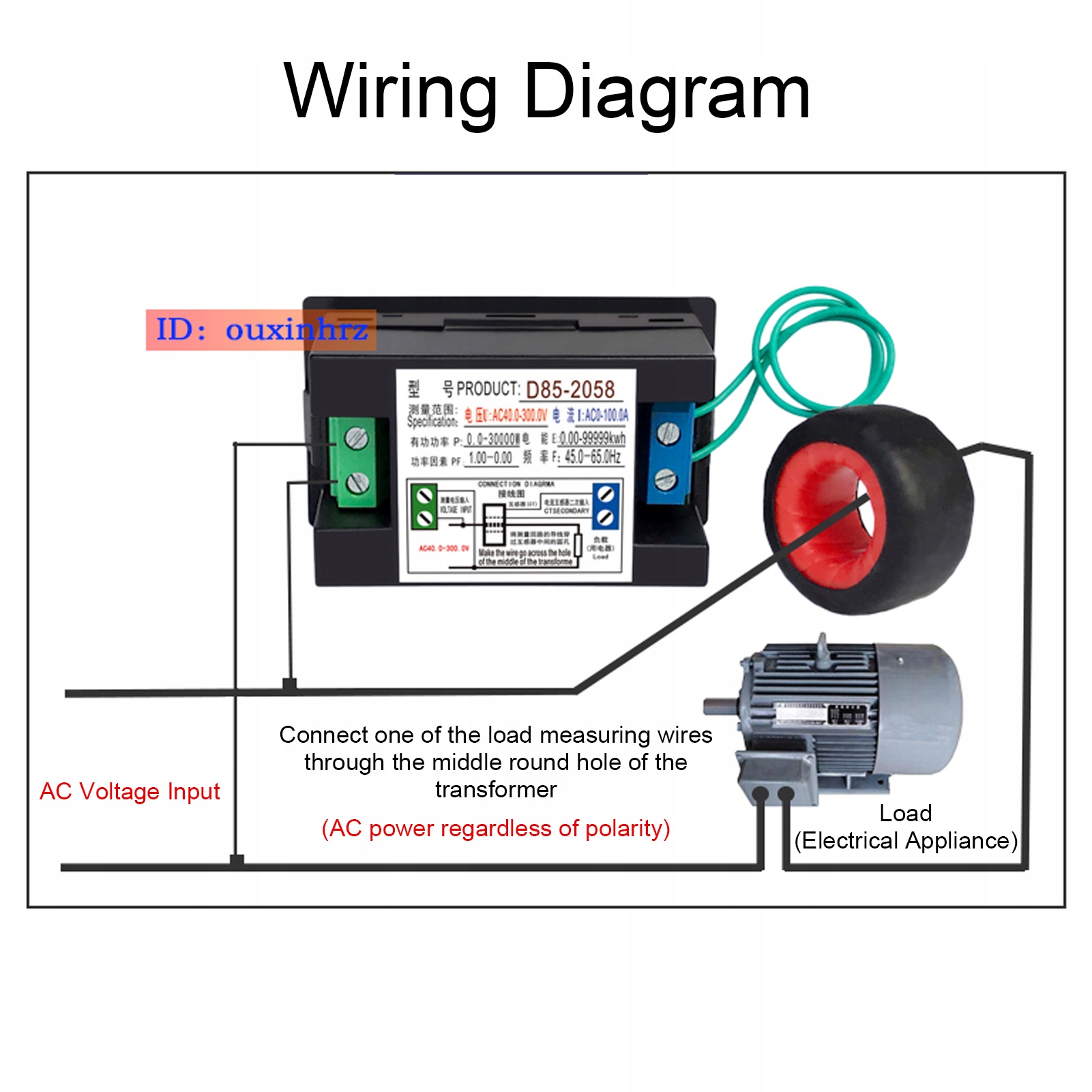 - Діапазон вимірювання струму змінного струму: змінний струм 0-99,99a, поточна роздільна здатність дисплея становить 0,01a, коли вона перевищує 100A, відображатиметься 100,0A.