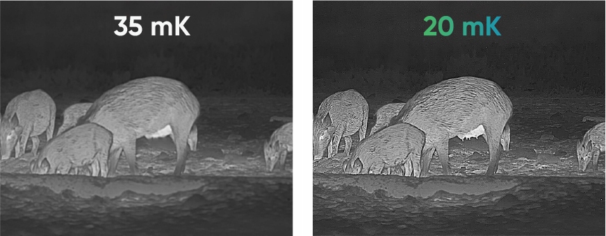 Висока теплова чутливість датчика забезпечує чудову роздільну здатність і відтворення деталей навіть у найскладніших атмосферних умовах, навіть коли різниця температур між об’єктом і навколишнім середовищем мінімальна. Це дає змогу швидко й чітко розрізняти найдрібніші деталі об’єктів і фону, як-от шерсть тварин, фізичні особливості самців, самок чи вагітних тварин, гілки, листя тощо.