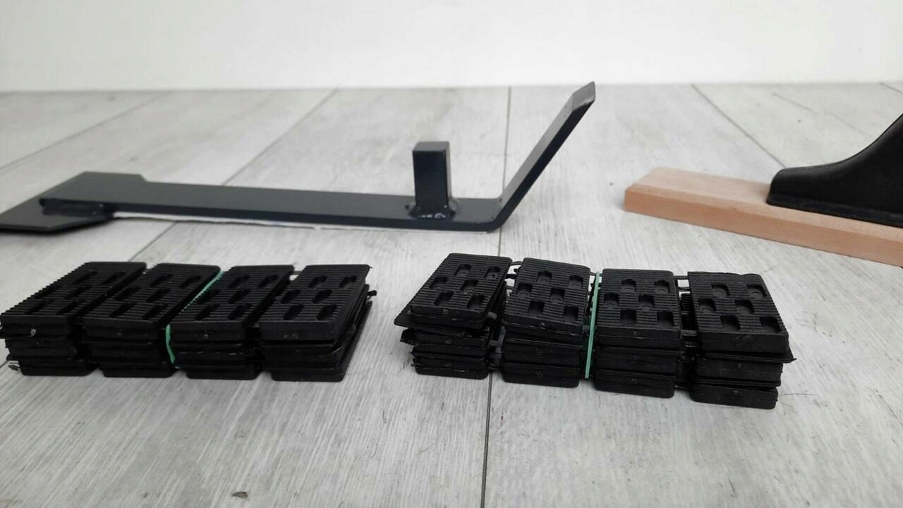 Монтажний набір використовується для монтажу та укладання панелей і дощок підлоги. У набір входить 40 пластикових клинів і дерев’яний і металевий блок, який використовується як важіль, щоб допомогти притиснути панелі до стіни.