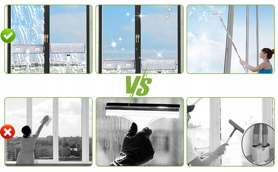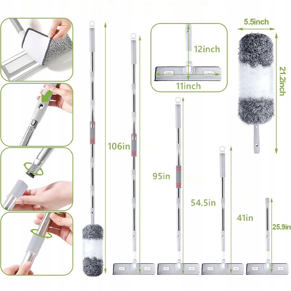 - Набір для миття вікон складається з подовжувача з 6 частин, 4 серветок для заміни, насадки для швабри та насадки для пилососу пір’я.