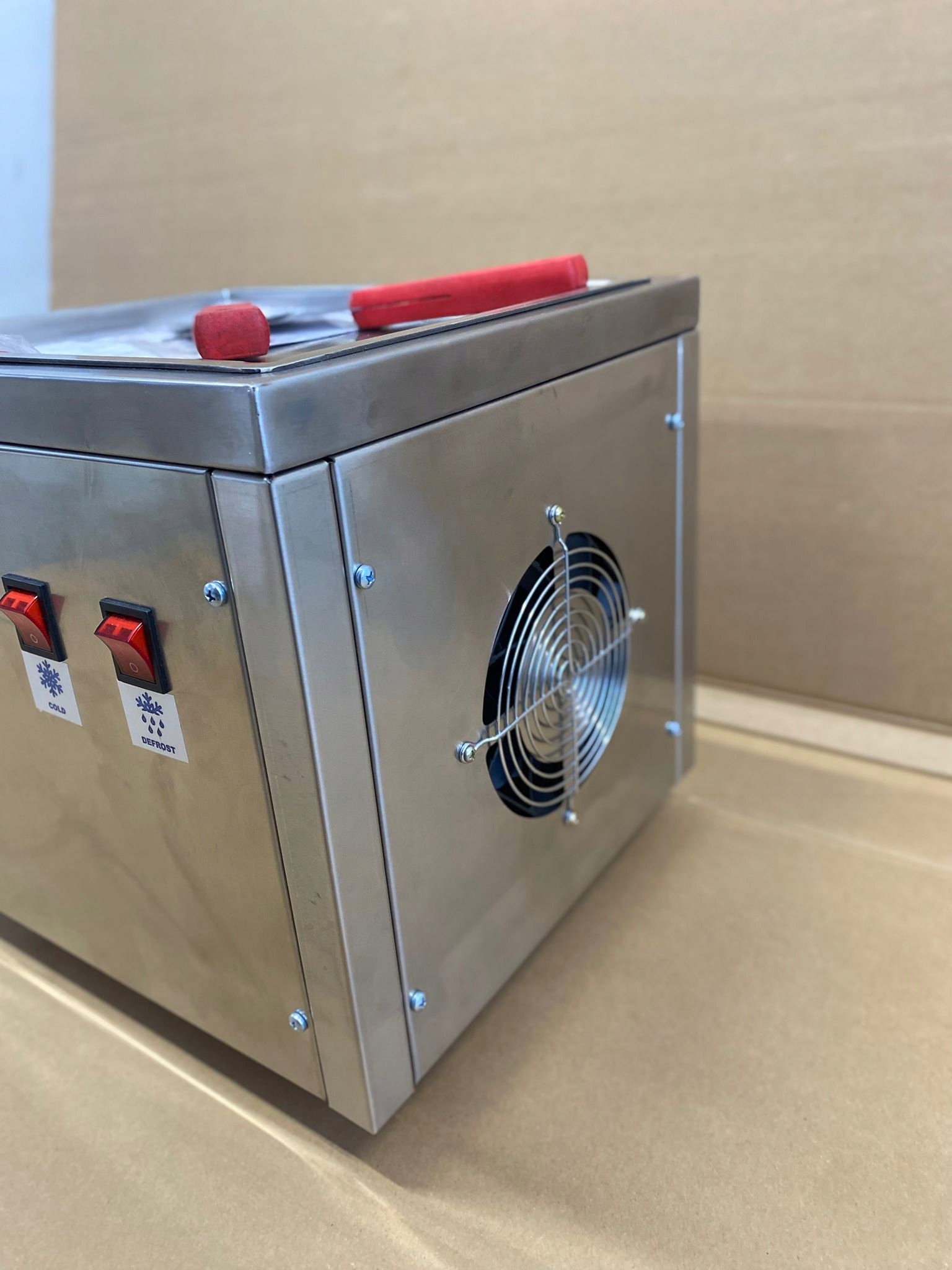 Оснащений двома кнопками (охолодження та розморожування) для зручного керування. Фірмовий компресор, серце системи охолодження, забезпечує ефективне охолодження та низьке енергоспоживання. Він може заморозити морозиво менш ніж за 3 хвилини.