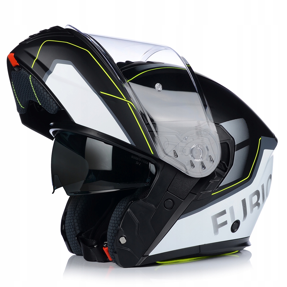 vito furio як один з небагатьох шоломів має подвійне схвалення - для водіння з піднятим і покинутим щелепою. Виробник також оснастив продукт кришкою підборіддя, а дефлектор носа , що запобігає спаренню скла.