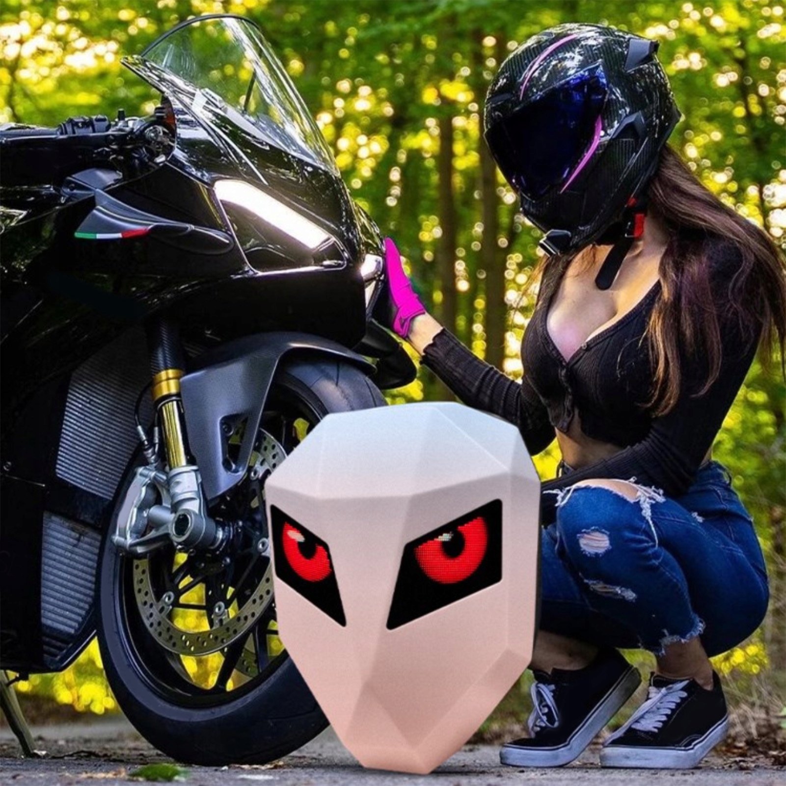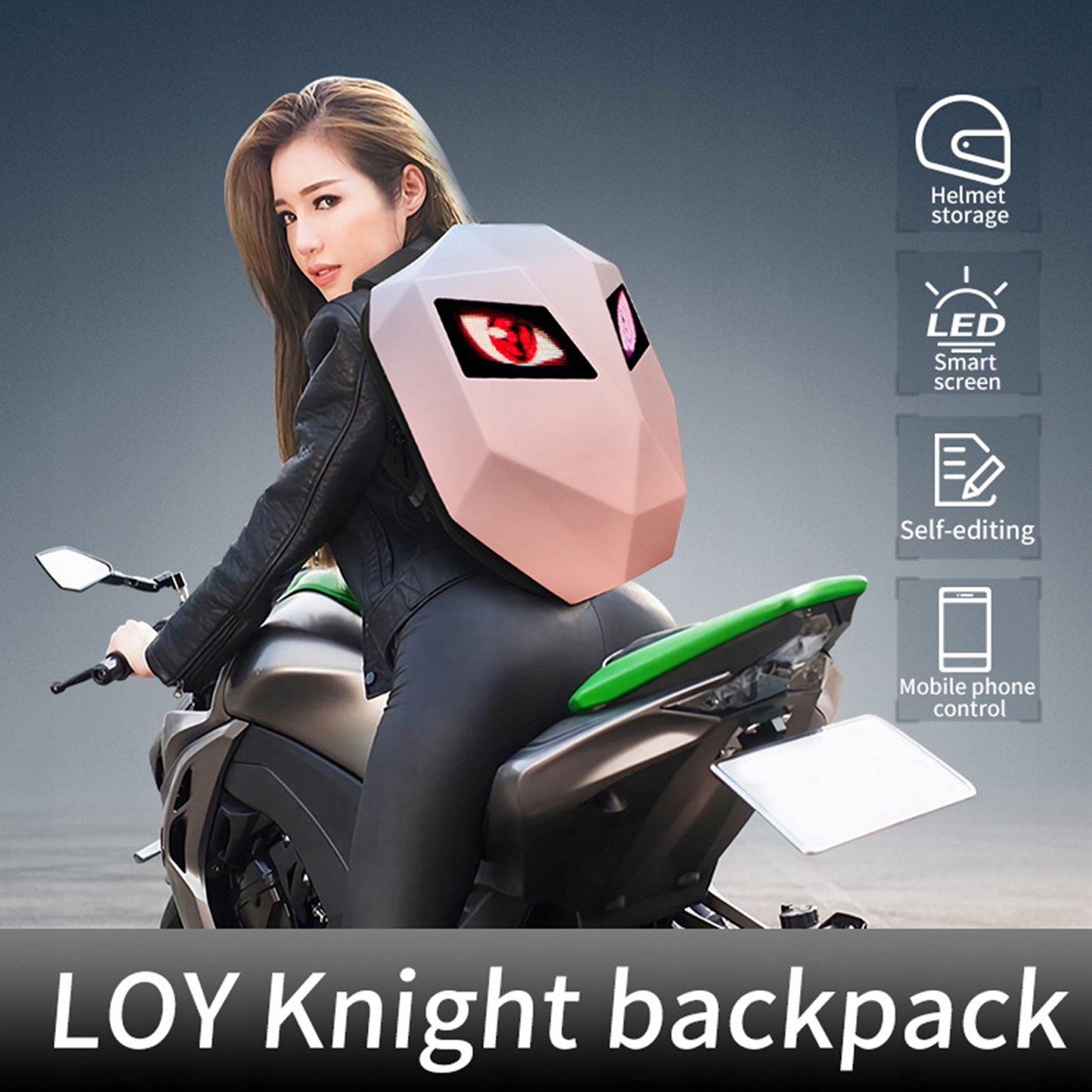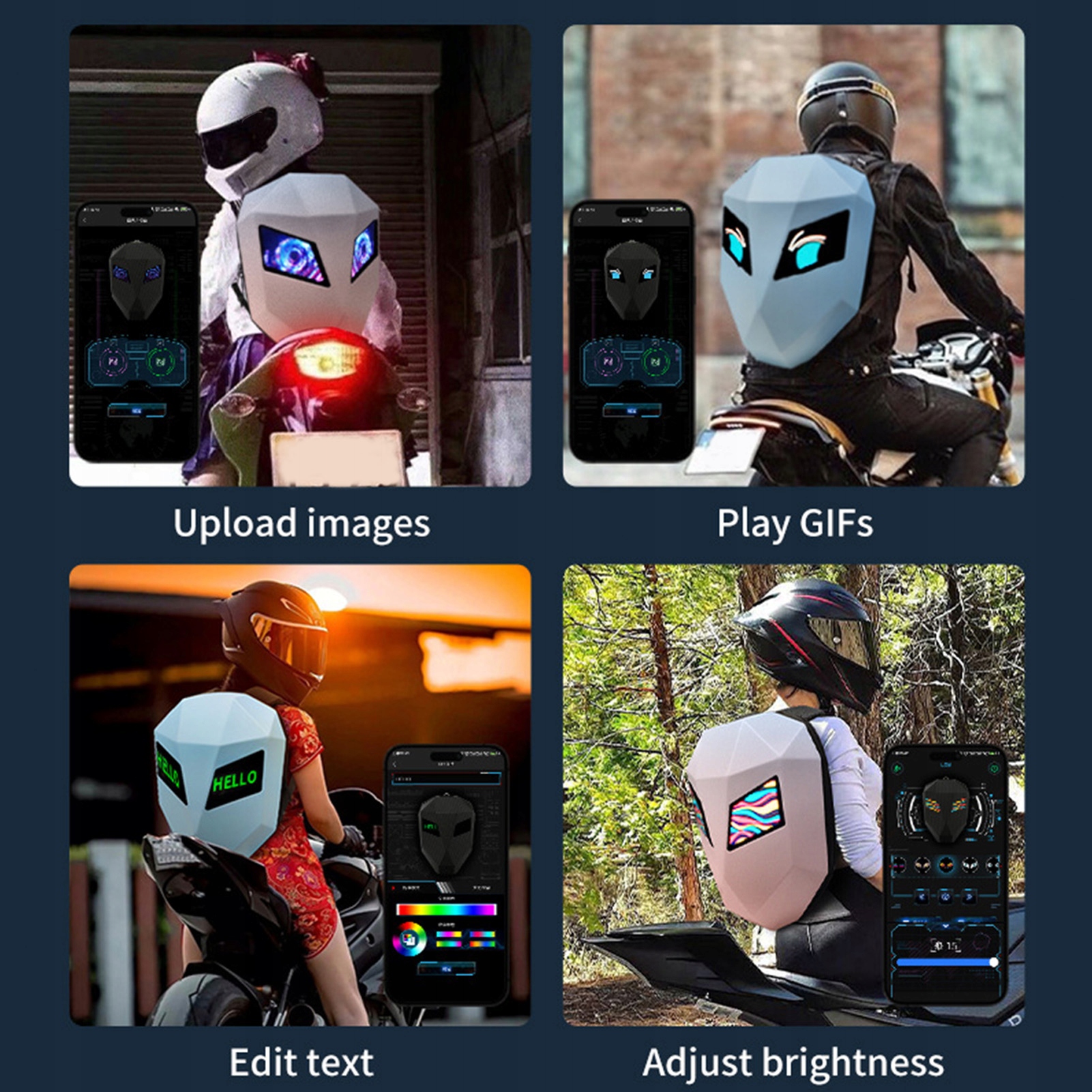 2. Програмований екран: цей світлодіодний мотоциклетний рюкзак оснащений програмованим екраном, який можна підключити до програми LOY EYES APP через Bluetooth, щоб вільно редагувати текст, анімацію та зображення. Змініть візерунок на свій розсуд, створіть рюкзак для ноутбука на свій вибір.