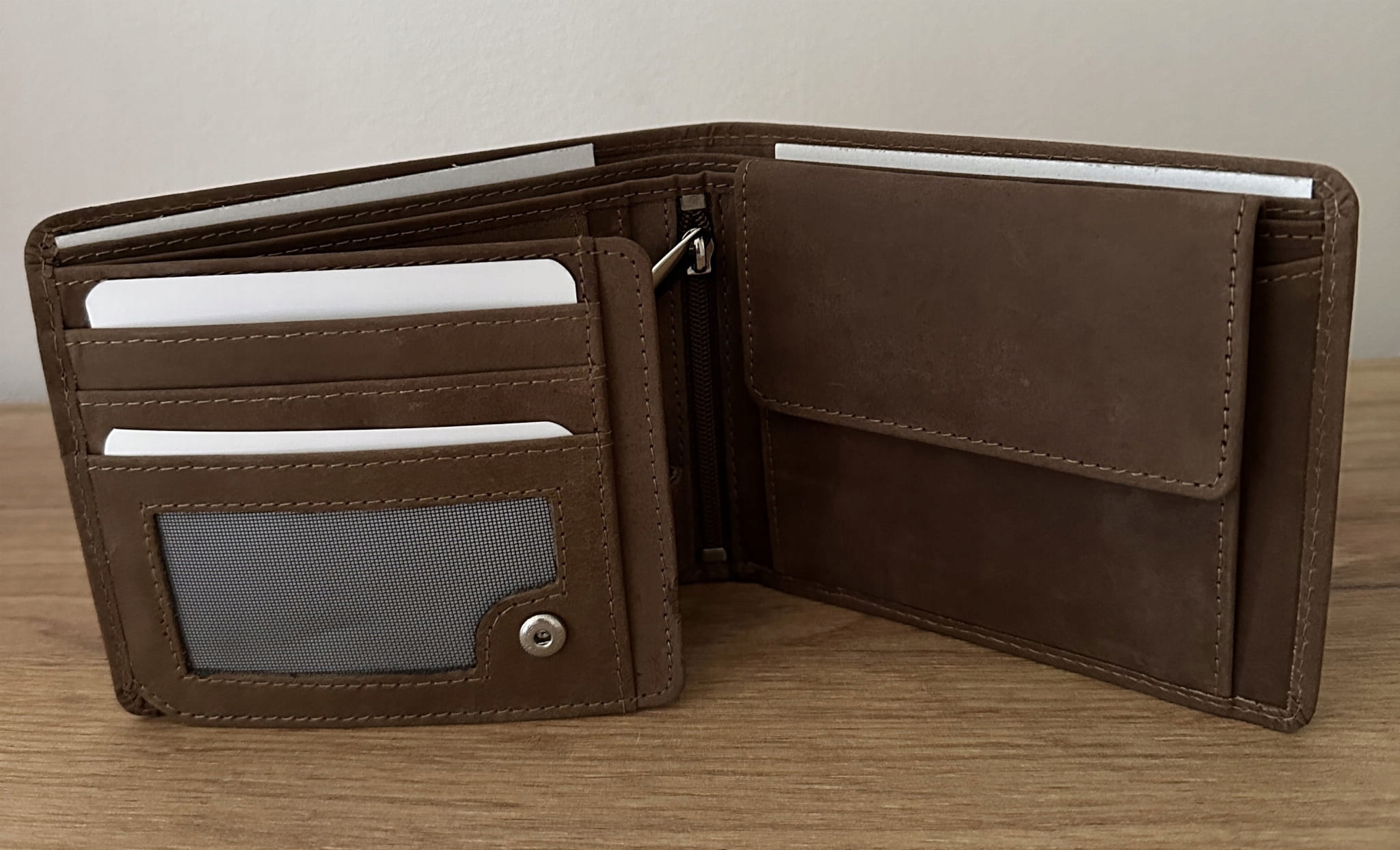 Привабливий чоловічий гаманець з високоякісної натуральної шкіри. Прикрашений масивним латунним ланцюжком. Закривається на блискавку. Всередині багато вкладок для карток, місце для реєстраційного свідоцтва та відділення для готівки.