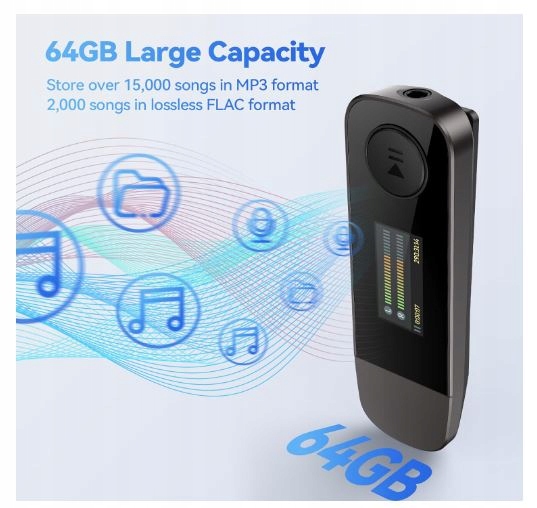 Agptek Portable MP3 64 ГБ програвач з Bluetooth 5.3 та Klipse, USB Type C, FM Radio, запис, USB -флеш -пам'ять, ідеально підходить для спорту та подорожей. Bluetooth 5.3. Завдяки розширеному кліпу ви можете легко прикріпити його до свого одягу, що робить його ідеальним супутником під час бігу, тренувань чи подорожей. Завдяки побудованій функції FM -радіо та запису, ви маєте доступ до улюблених музичних та радіостанцій в будь -якому місці. Автоматичне з'єднання з попереднім Bluetooth. Гравець також може використовуватися як флеш -пам'ять USB, ідеально підходить для зберігання офісних та навчальних файлів. Включає кабель типу U для більшої зручності. Повна зарядка займає лише 2 години.