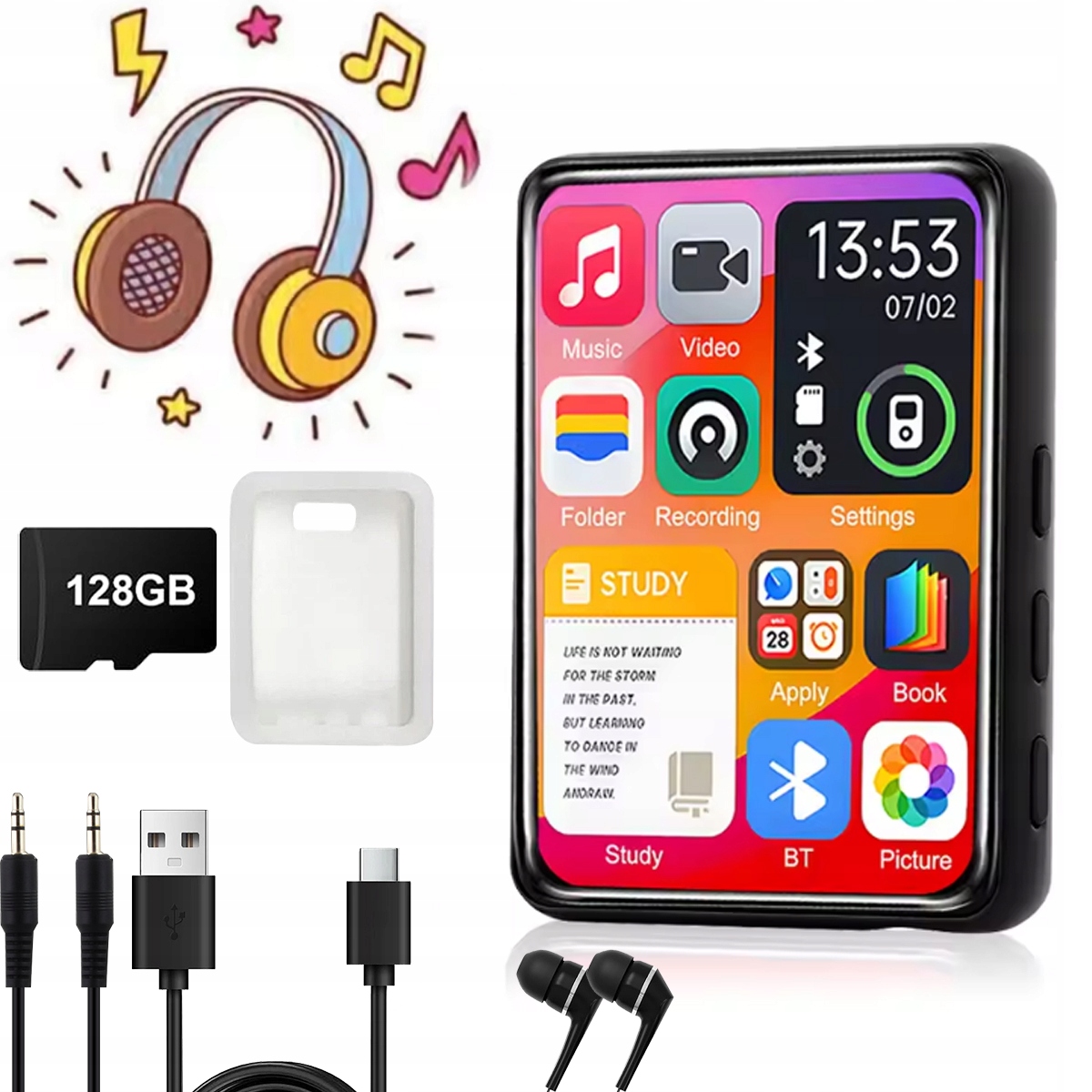 MP3-плеєр на 128 ГБ, Bluetooth 5.3, 2,4-дюймовий сенсорний екран, звук Hi-Fi, вбудований динамік, запис, розширюється до 512 ГБ, підходить для дітей (чорний)