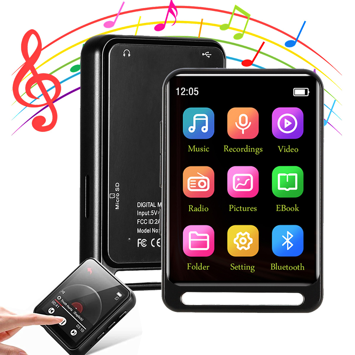 - Багатофункціональний і практичний. Цей MP3-плеєр може не лише підтримувати з’єднання Bluetooth, FM-радіо, запис, перегляд фотографій і читання електронних книг, але також підтримує екранну заставку та блокування однією клавішею.
