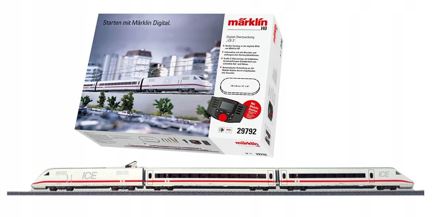 Стартовий набір ICE 2. Ідеальний початок у цифровому світі Arklin H0. Локомотив з цифровим декодером mfx і широкими звуковими функціями. Велика С-подібна доріжка з міцною деталізованою підкладкою для швидкого налаштування та демонтажу. Автоматична реєстрація на мобільній станції з вбудованим декодером mfx.