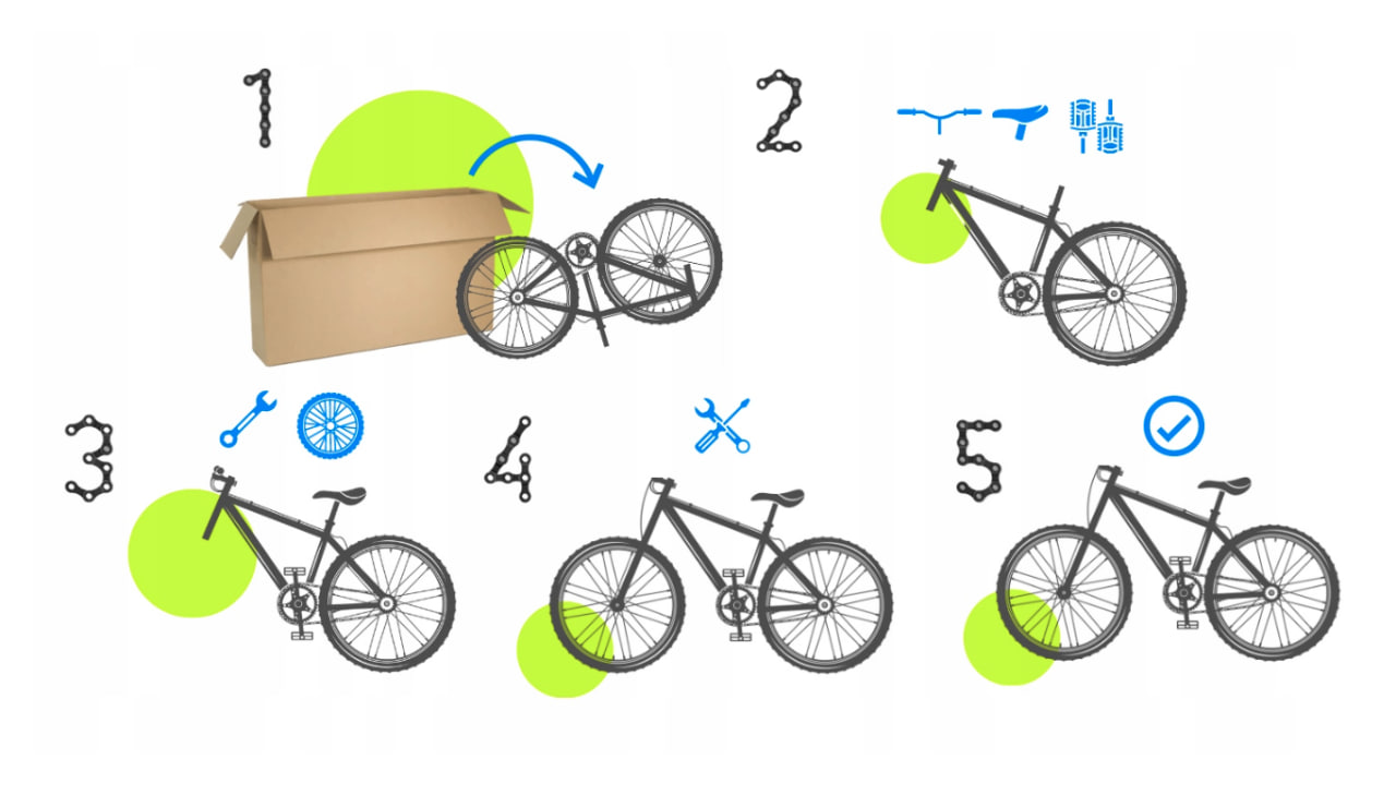 Велосипед попередньо зібраний, все, що вам потрібно зробити, це прикрутити кермо, переднє колесо, педалі та сідло.