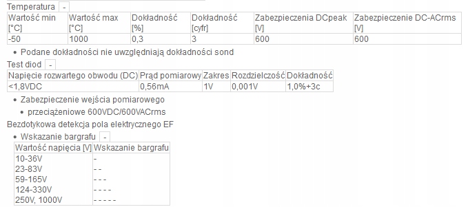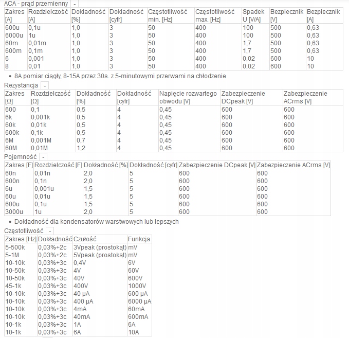 Точність: +- (% від зазначеного значення + кількість молодших значущих цифр), якщо не вказано інше, для температури 23 градуси C +- 5 градусів і відносної вологості до 75%