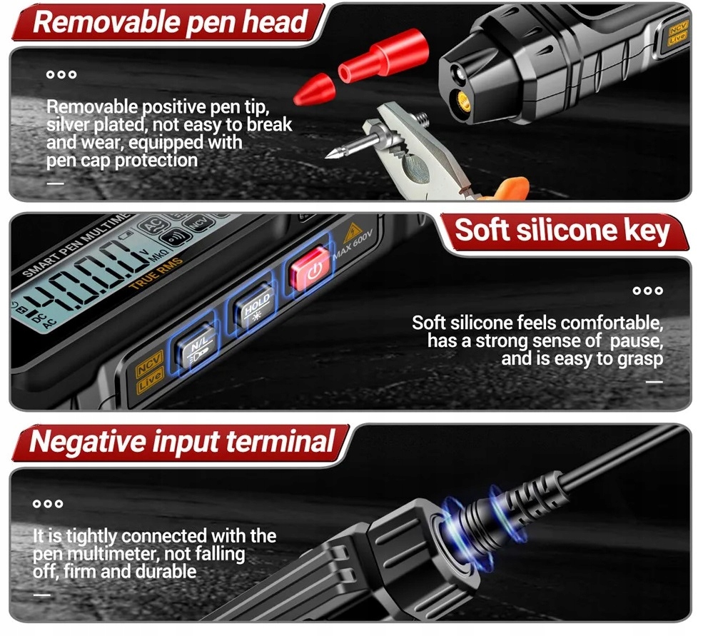 З функцією ліхтарика: PEN-мультиметр має ліхтарикна наконечнику, який допомагає ефективно освітлювати темні та важкодоступні місця. -бачте області, що дозволяє легко працювати в умовах слабкого освітлення. Завдяки ергономічному дизайну та портативному розміру ліхтарик можна брати куди завгодно, що дає вам можливість працювати в різних середовищах.