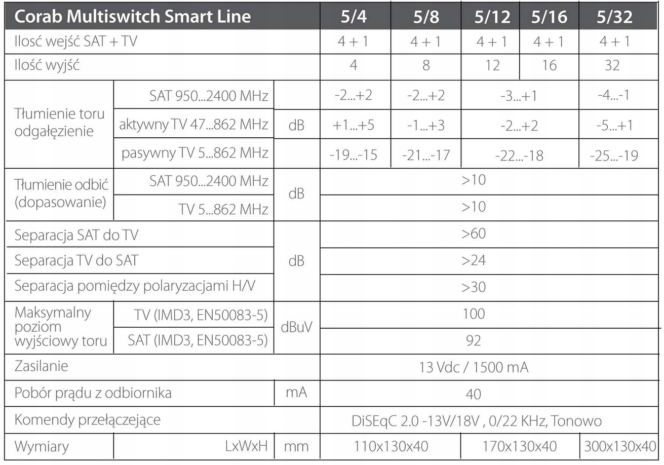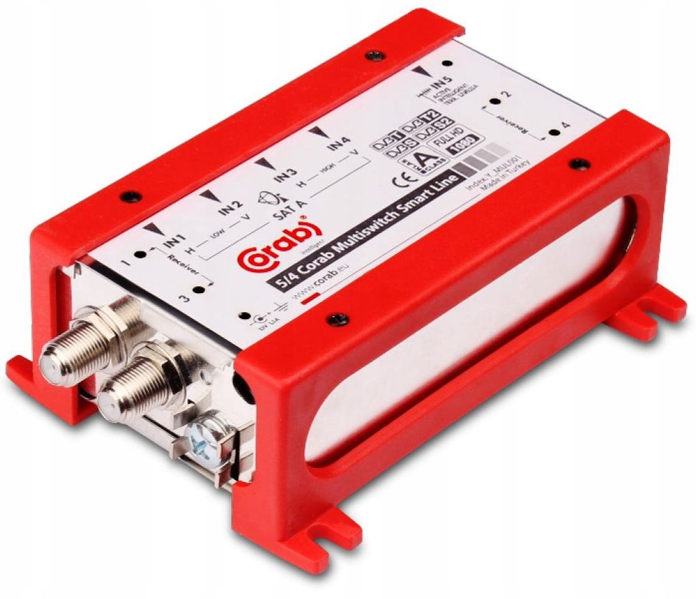 Мультисвіч Corab 5/4 Smart Line з 4 супутниковими входами для одного конвертора Quattro та 1 входом від ефірної телевізійної антени (DVB-T) дозволяє розповсюджувати сигнал на 4 абонентські розетки супутникового телебачення (розетки є в нашому пропозиція).