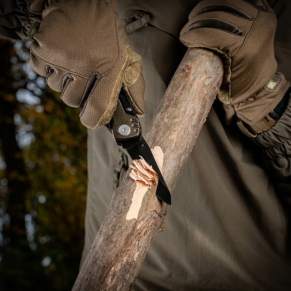 Каркас і всі елементи виготовлені з нержавіючої сталі з антибліковим покриттям. Форма ручки забезпечує міцний хват, а завдяки отворам зменшується вага пристрою. Завдяки замку - liner lock - лезо ножа безпечне у використанні.