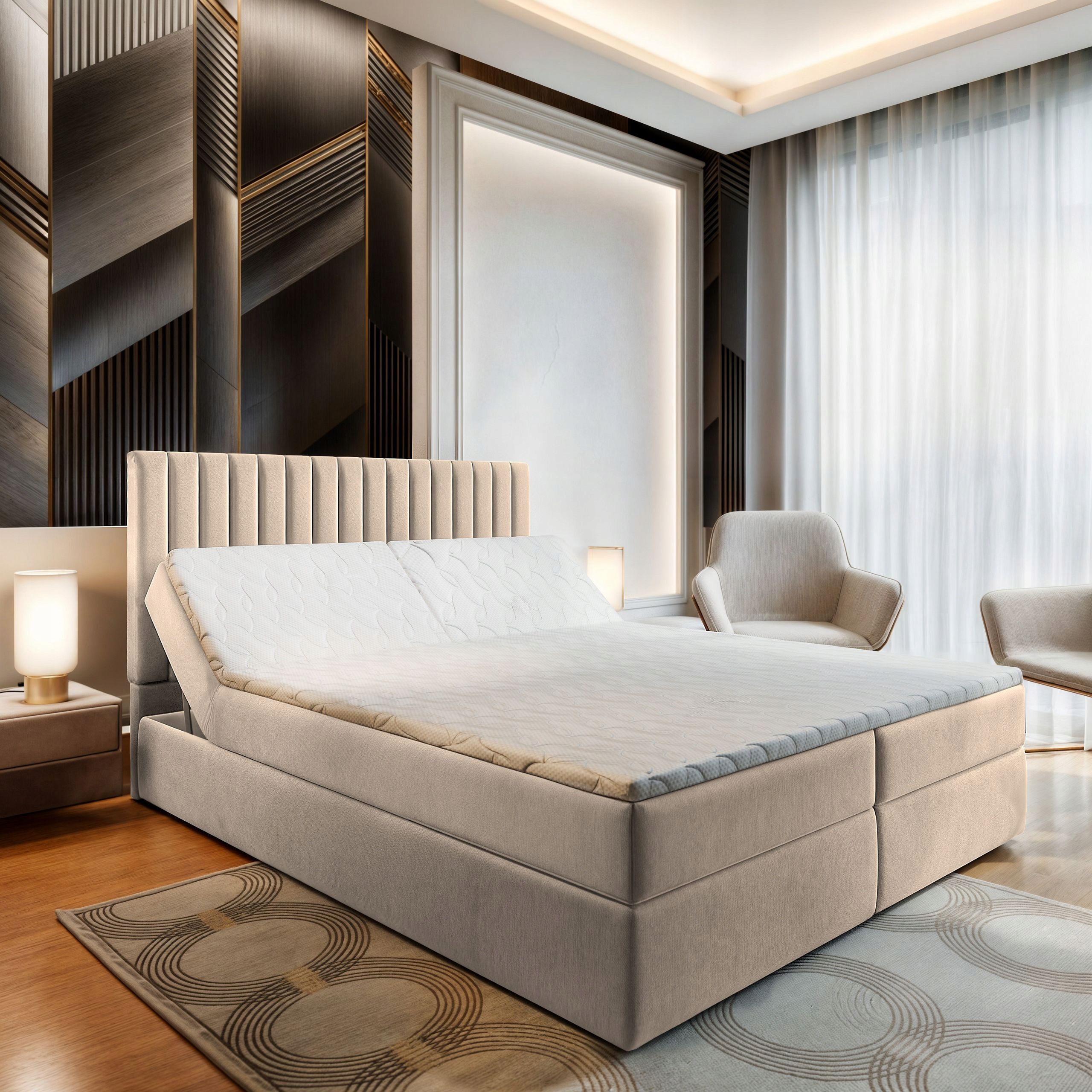 Топпер включає стьобаний чохол з високоякісних гіпоалергенних матеріалів. Завдяки цьому ваш сон буде здоровим і відновлюючим. Топпер не є частиною аукціону. Це спеціальний аксесуар, виготовлений нами, який можна придбати разом із ліжком у наборі у верхній частині аукціону. Щоб повною мірою скористатися функцією регулювання, потрібен роздільний топпер.