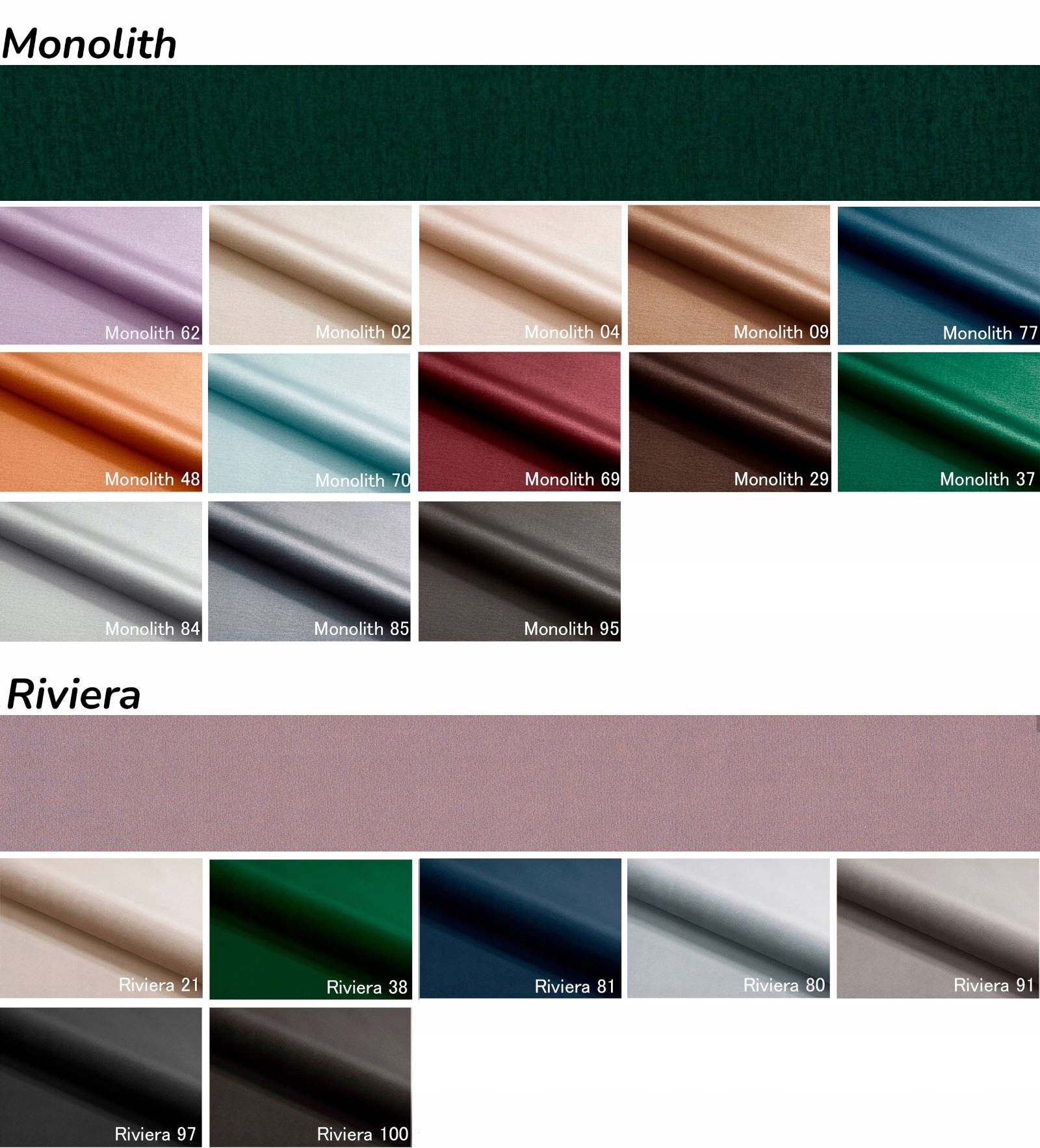 Вона міцна і довговічна, але при цьому м'яка і дуже приємна на дотик. Він доступний у наймоднішій, збалансованій кольоровій гамі, збагаченій акцентами баклажанового, зеленого, темно-синього та рожевого кольору. Тканина покрита спеціальним захисним шаром, який створює гідрофобне покриття, яке захищає від швидкого просочування рідин.