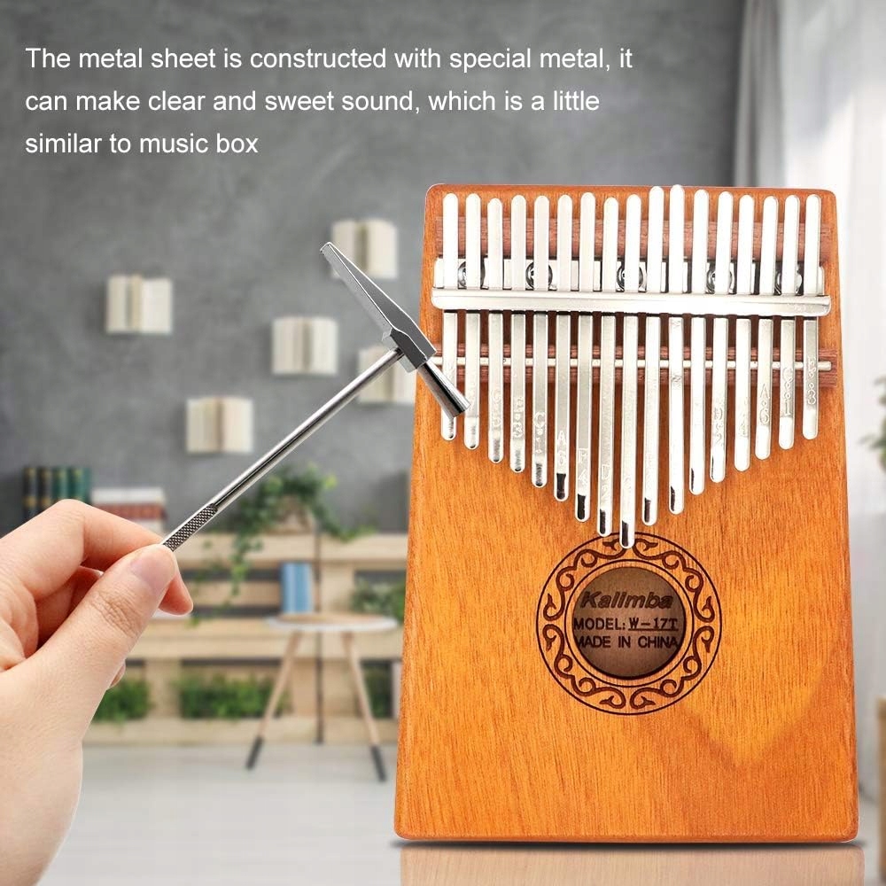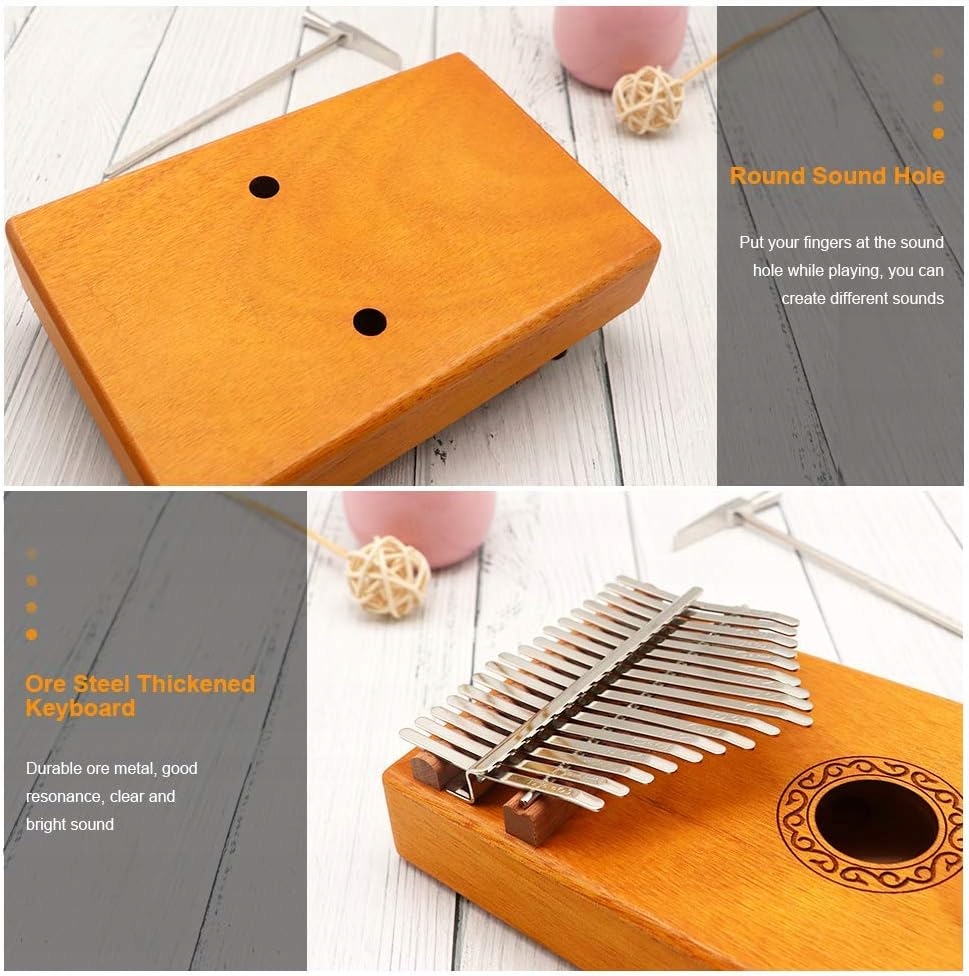 - Виготовлений із високоякісногокорпусу з червоного дерева з 17 регульованими зубцями з вуглецевої сталі, ця калімба пропонує більш яскравий і чистий звук, довша підтримка та комфортне відчуття дотику.
