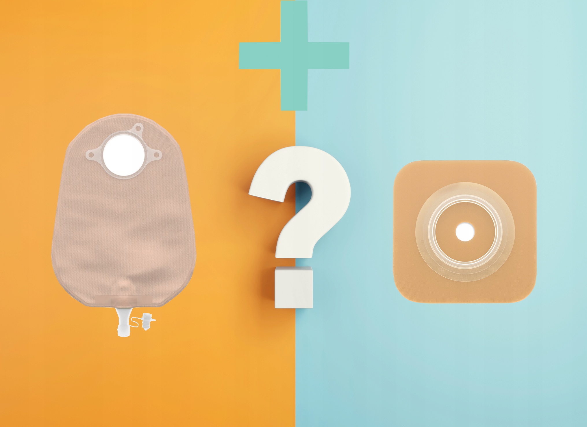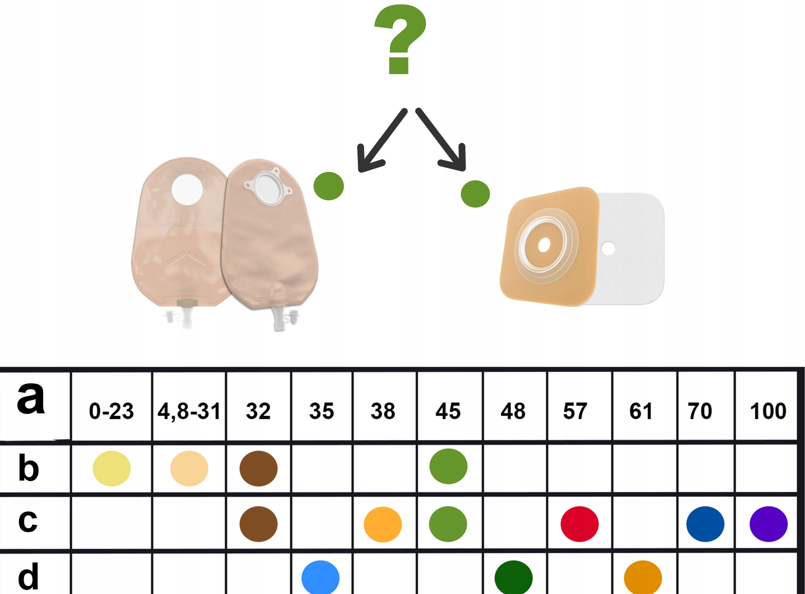 b), пришита до засувки з мішкою. Перевага полягає в тому, що плитку можна навіть приклеїти до шкіри протягом декількох днів, а щоденну заміну слід піддавати лише мішку з остомії.