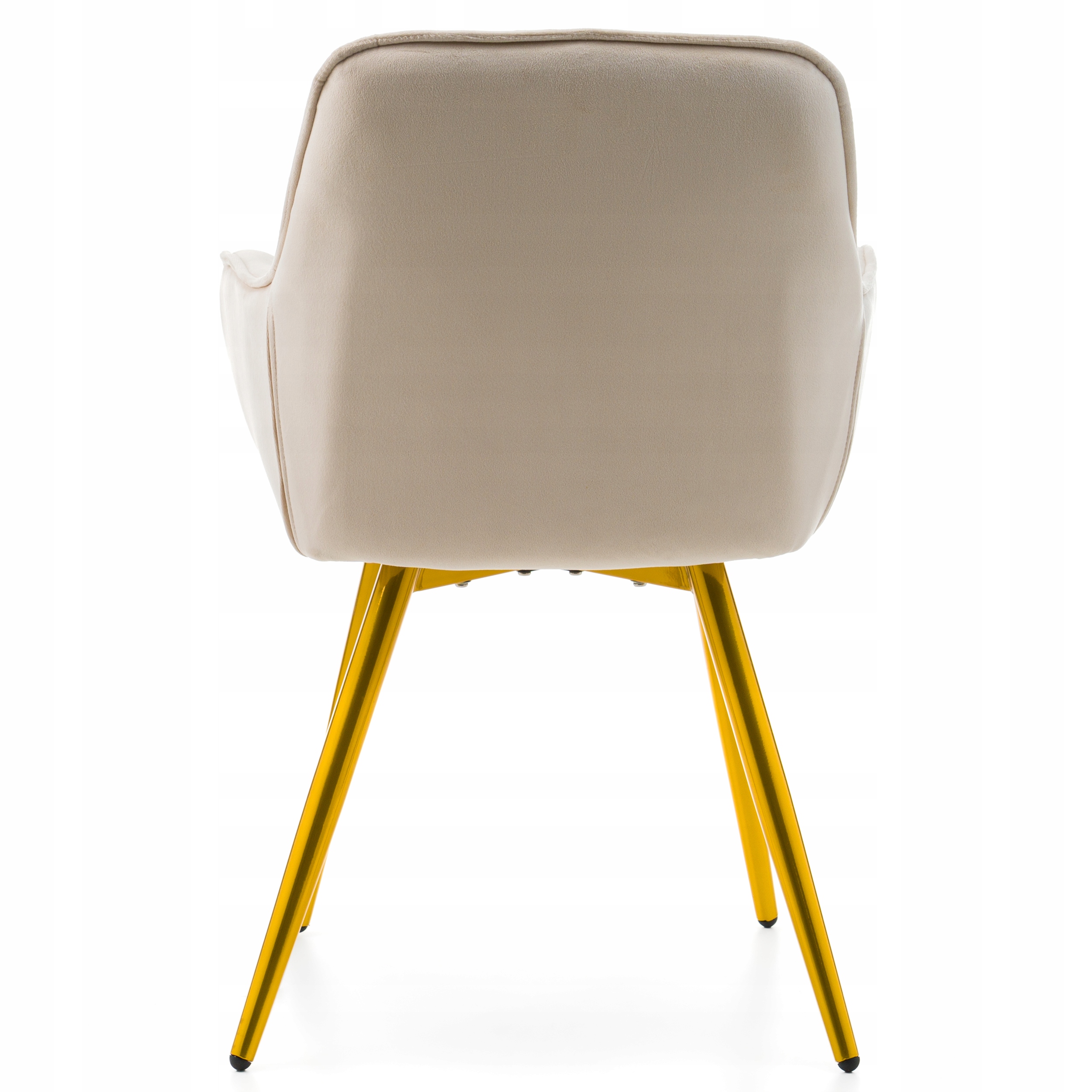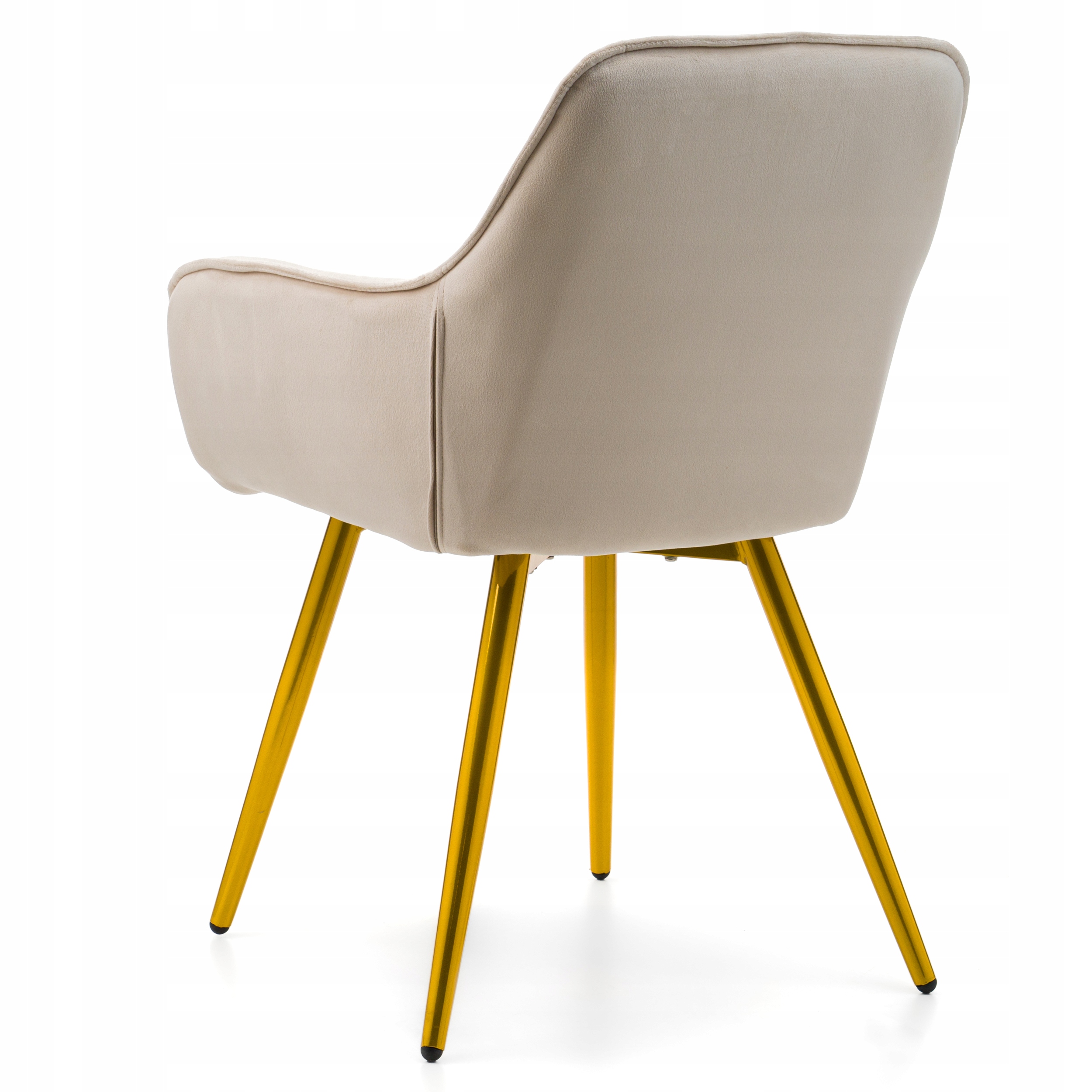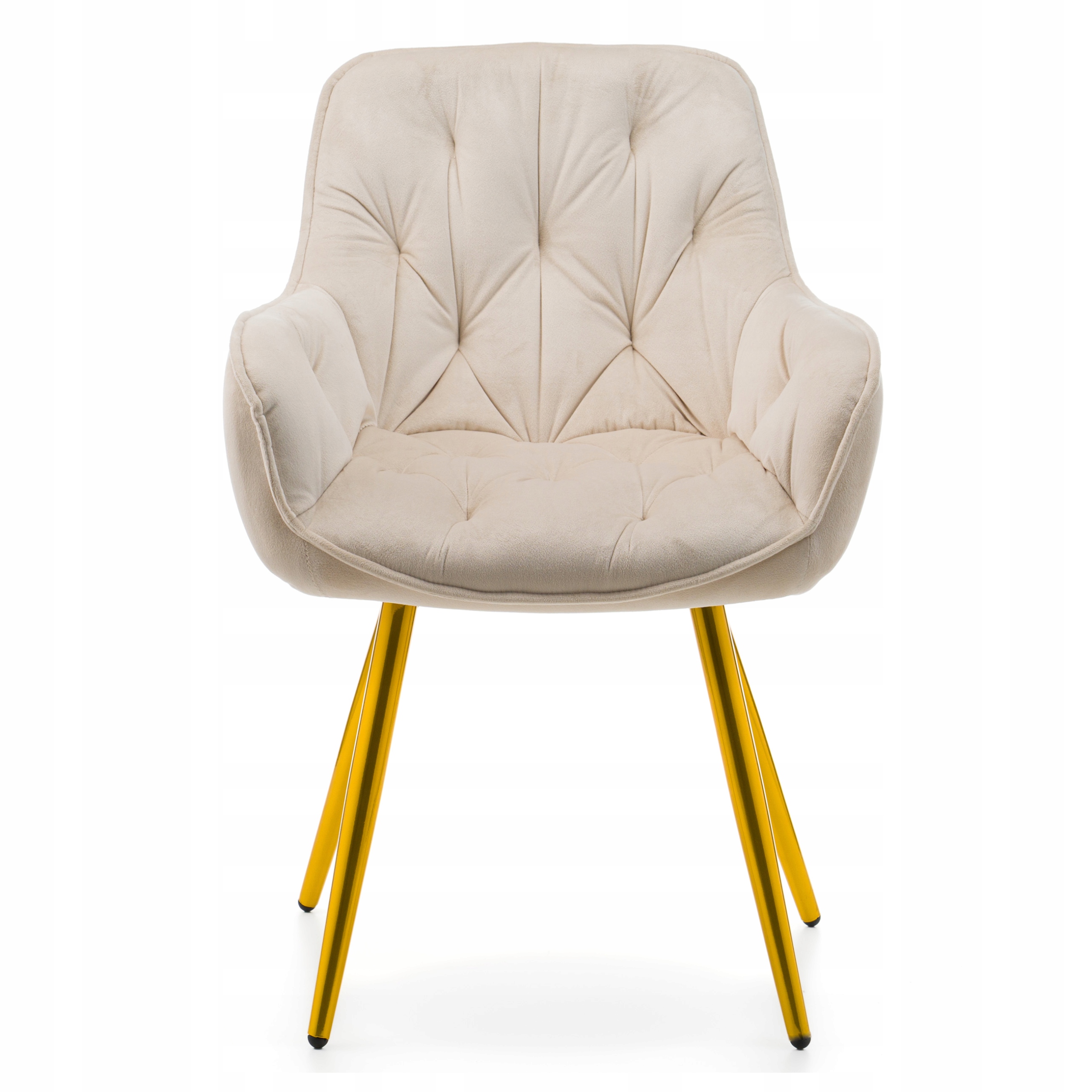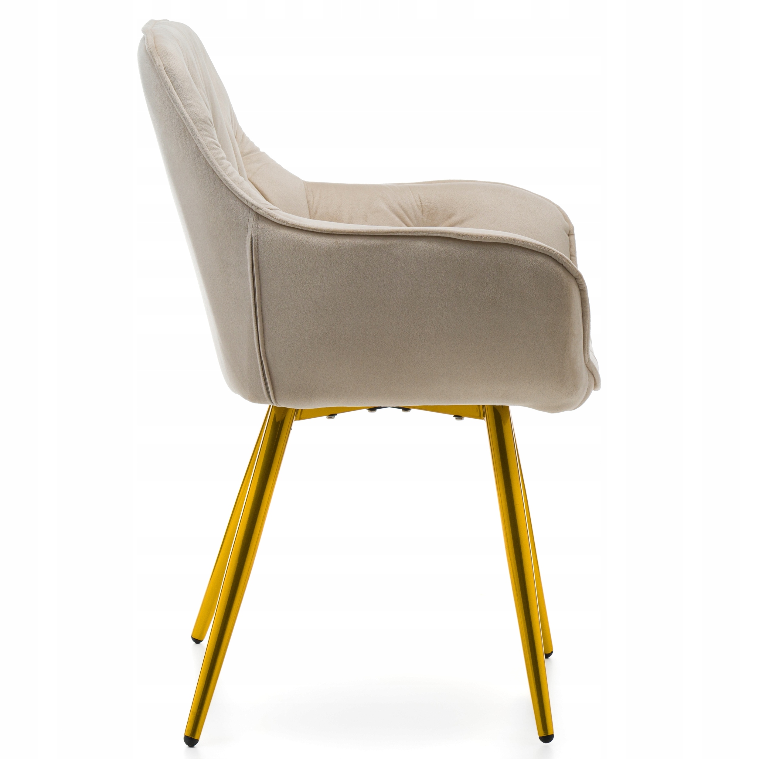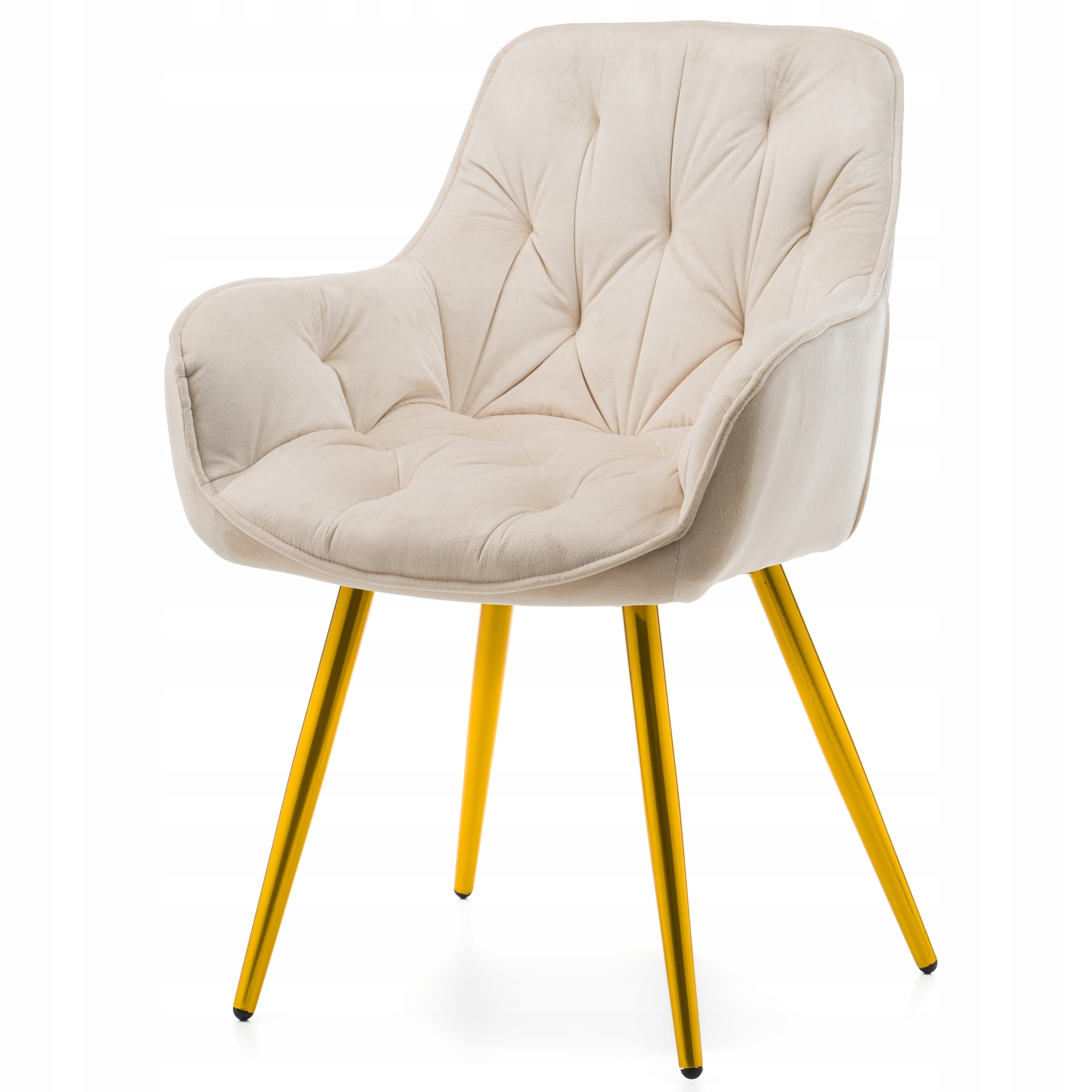 Стілець оббивки оксамитовий на дотик з оксамитовою тканиною в бежевому . Сидіння наповнене з декількох сантиметрів шару м'якої піни , а стильне квілінг додає чарівного прикраси передньої сторони спинки. Тонкі ноги були виготовлені з , пофарбовані в золотий колір . Крім того, у крісла є підлокітники.