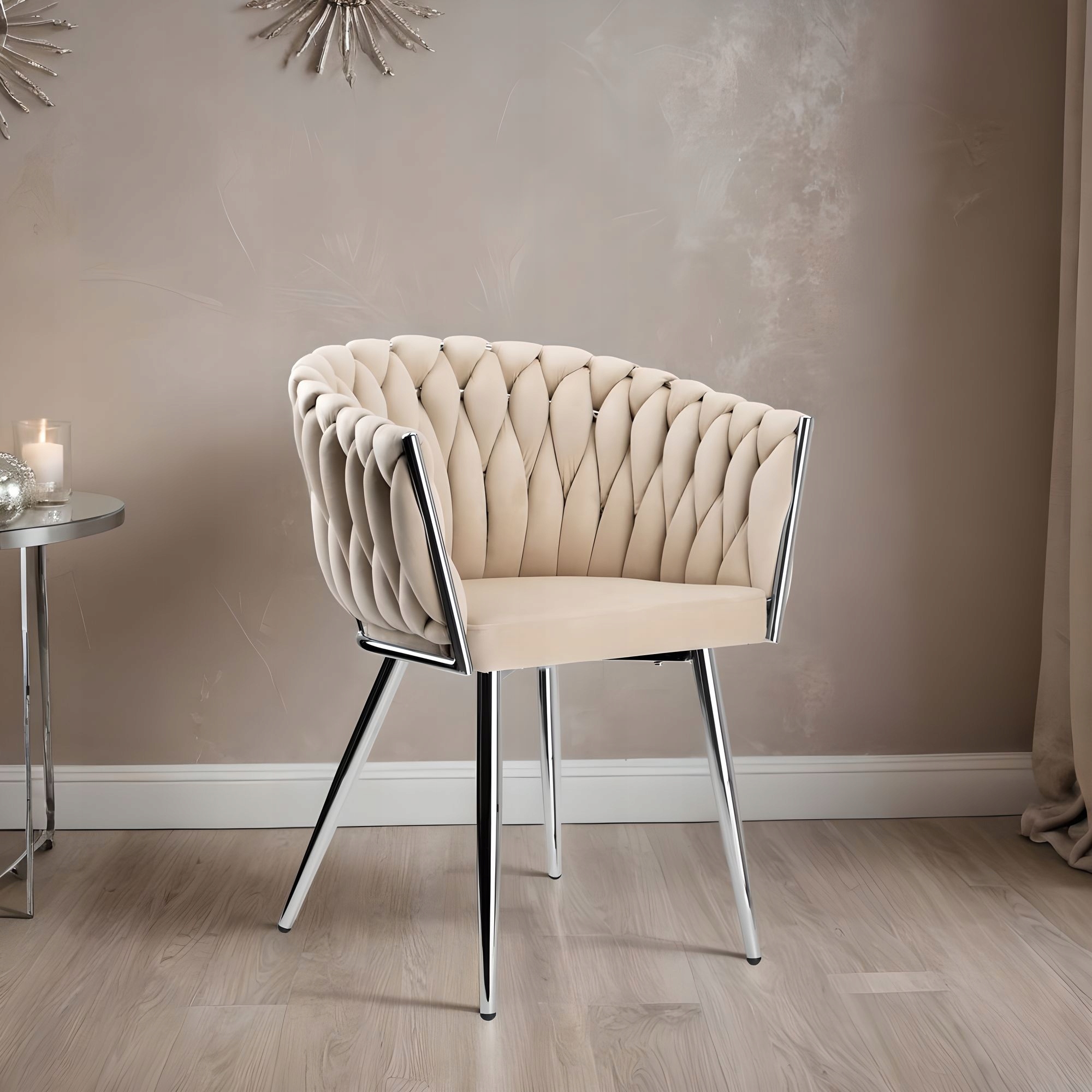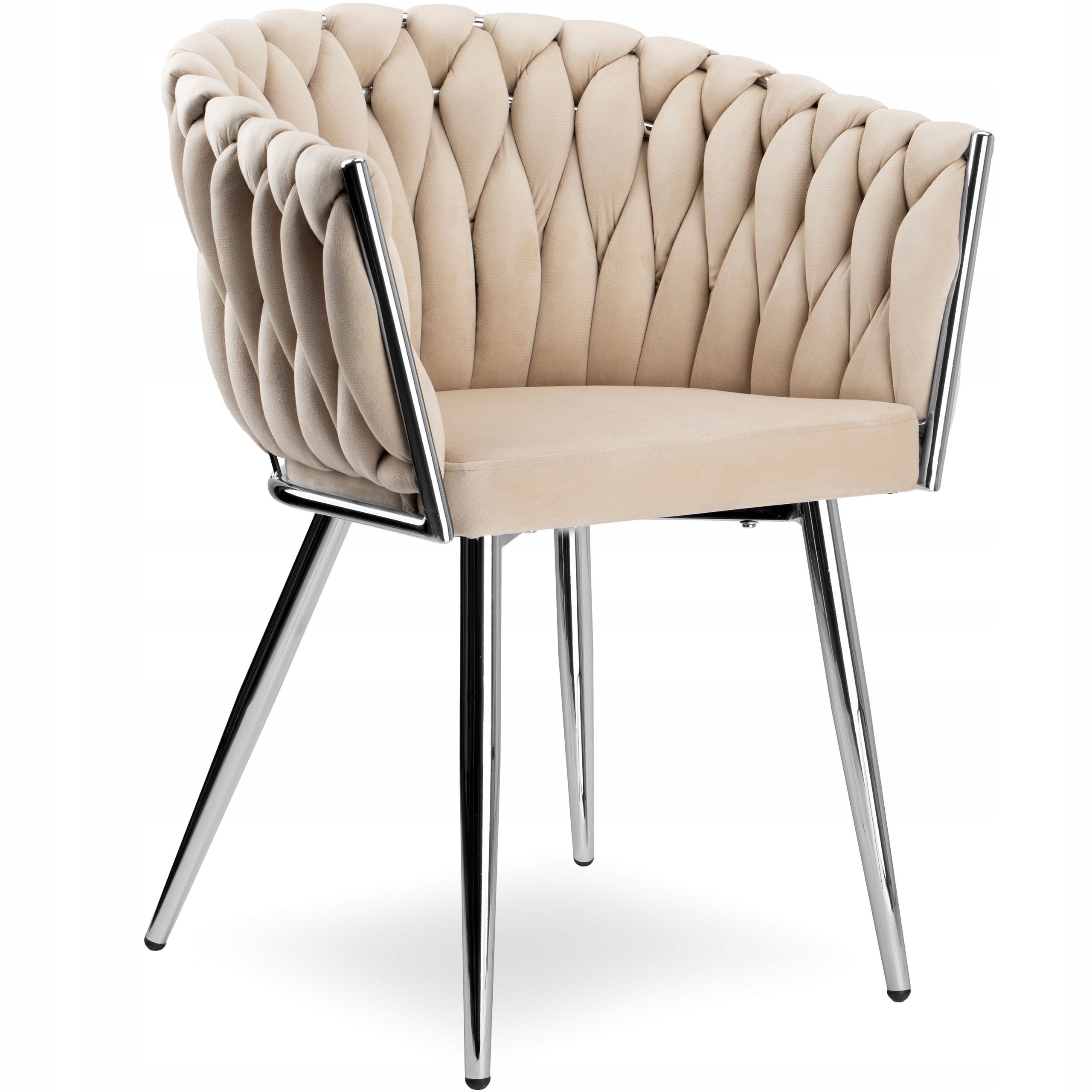 Cutton Chrome Velor Chair - гармонійне поєднання glamour Style з функціональністю, ідеально підходить для сучасних домашніх інтер'єрів. Сидіння, покрите м'якою, велюровою тканиною , забезпечує винятковий комфорт і додає інтер'єру розкішного персонажа. мерехтливі, металеві ноги в хромовій кольорі гарантують стабільність та довговічність, підкреслюючи сучасний та елегантний вигляд крісла. Унікальна назад, виготовлена з переплетених велюрових коси , забезпечує додаткову підтримку та зручність, а також є оригінальним декоративним елементом.