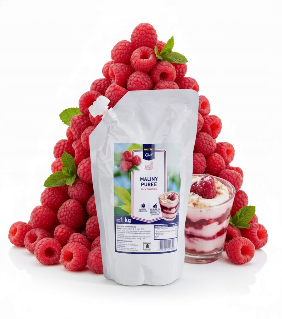 Насолоджуйтесь смаком літа в будь-яку пору року! Малинове пюре METRO Chef - це надзвичайно ароматне фруктове пюре з 90% малини та 10% цукру, яке насолоджує насиченим смаком і кольором свіжих фруктів.