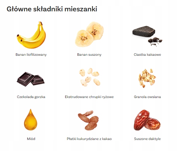 СКЛАД: гранола 47% (вівсяні пластівці, фініковий сироп [фініки], пшеничне борошно, пшеничне борошно спельти, рисове борошно, рисові чіпси екструдовані [рисове борошно], мед, рапсова олія, нежирне какао, натуральний ароматизатор, емульгатор : лецитини, морська сіль), кукурудзяні пластівці з какао (кукурудзяна крупа, цукор, нежирне какао, сіль, екстракт ячмінного солоду), сушені фініки (фініки, рисове борошно), сушені банани 5,5% ( банани 95%, рисове борошно), екструдовані рисові чіпси (рисове борошно), темний шоколад 2,5% (какао терте, цукор, какао-масло, емульгатор: лецитин), какао-печиво 2% (пшеничне борошно, цукор , кокосова олія, нежирне какао, розпушувач: бікарбонат натрію, сіль), ліофілізовані банани 1, 5%.