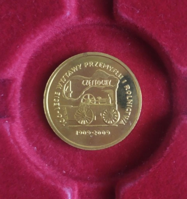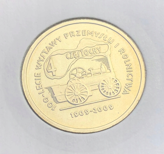 Аверс: Паровий сільськогосподарський трактор, над ним горизонтальний напис: 4 CZĘSTOCHY, під ним горизонтально дати: 1909 - 2009, зліва, вгору, праворуч, напис півколом: 100-LECIE WYSTAWY PRZEMYSŁU I ROLNICTWA