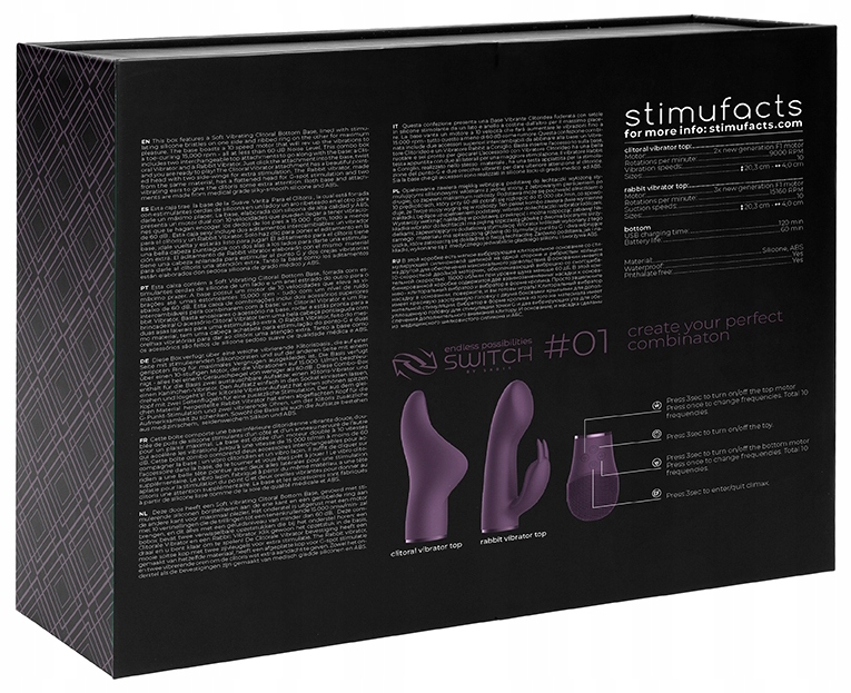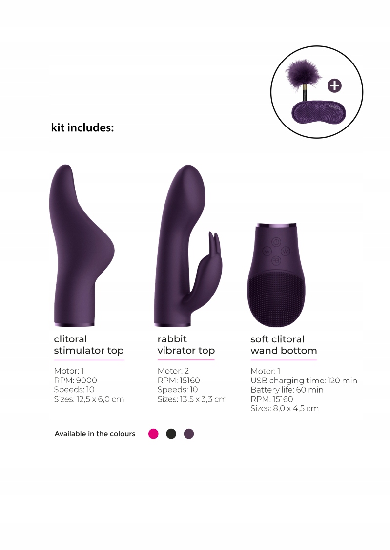 Упаковка містить м'яку вібраційну основу для клітора, вистеленого стимулюючими силіконовими волосками з одного боку, з благальним кільцем з іншого, що забезпечить максимум задоволення. - що змусить ваші ноги вступати в задоволення. Цей пакет Kombo містить дві замінні накладки, які доповнюють основу: вібратор для клітора та вібратора зайчика. Просто вставте накладку в основу, крутити, і ви можете почати весело! Накладка вібратора для клітора має прекрасну загострену голову з двома бічними крилами, забезпечуючи додаткову стимуляцію. Вібратор зайчика, виготовлений з того ж матеріалу, має сплющену голову для стимулювання точки G та двох вібраційних вух, які дбають про ваш клітор. І основа, і накладки виготовлені з медичного шовковистого гладкого силікону та абс.