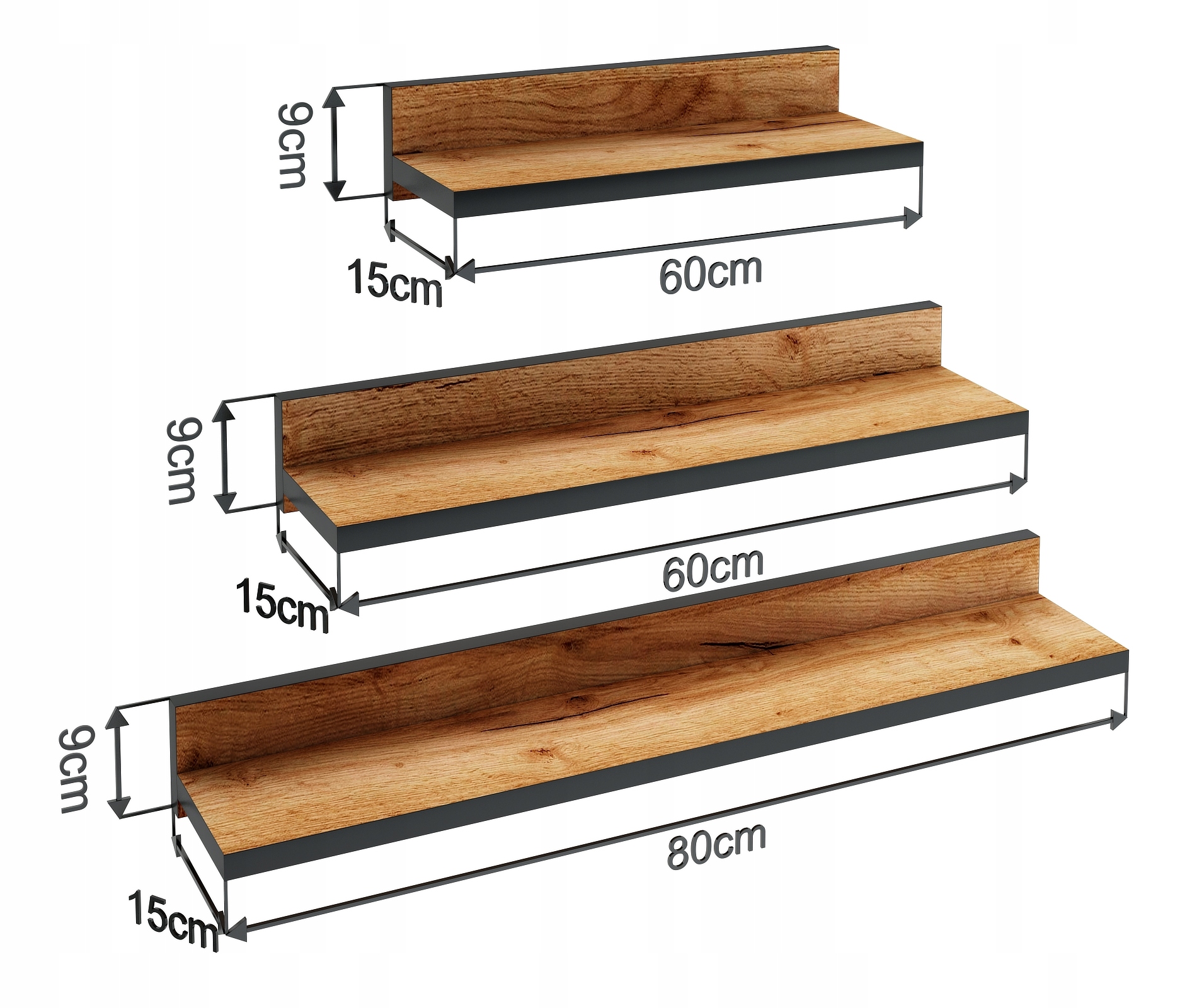 Набір з 2 дубових навісних полиць 80 см з настінною планкою (2 шт.) і чорного кольору.