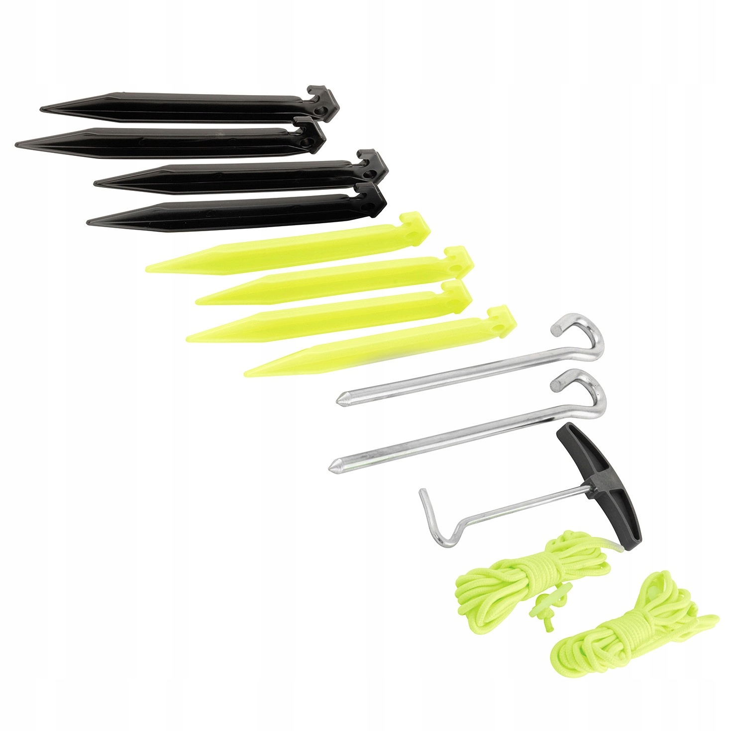 Кілки, на відміну від класичних кілочків , сплощені. Завдяки цьому їх поверхня контакту з землею більша, що забезпечує краще зчеплення кріплень. Це додасть вашому туристичному притулку додаткової стійкості. Використаний матеріал і форма оселедців роблять їх стійкими до деформації. Шпильки в наборі виготовлені зі сталі, яка є дуже міцною. Крім того, вони широкі, тому добре тримають кріплення. Вставляти та виймати оселедці дуже просто. Більше того, їх також можна вийняти з землі за допомогою пристрою, що входить у комплект. Має форму гачка, з пластиковою ручкою. Останнім елементом в комплекті є дві люмінесцентні лінії. Вони працюватимуть як змінні розтяжки, що зробить ваш намет більш видимим уночі.