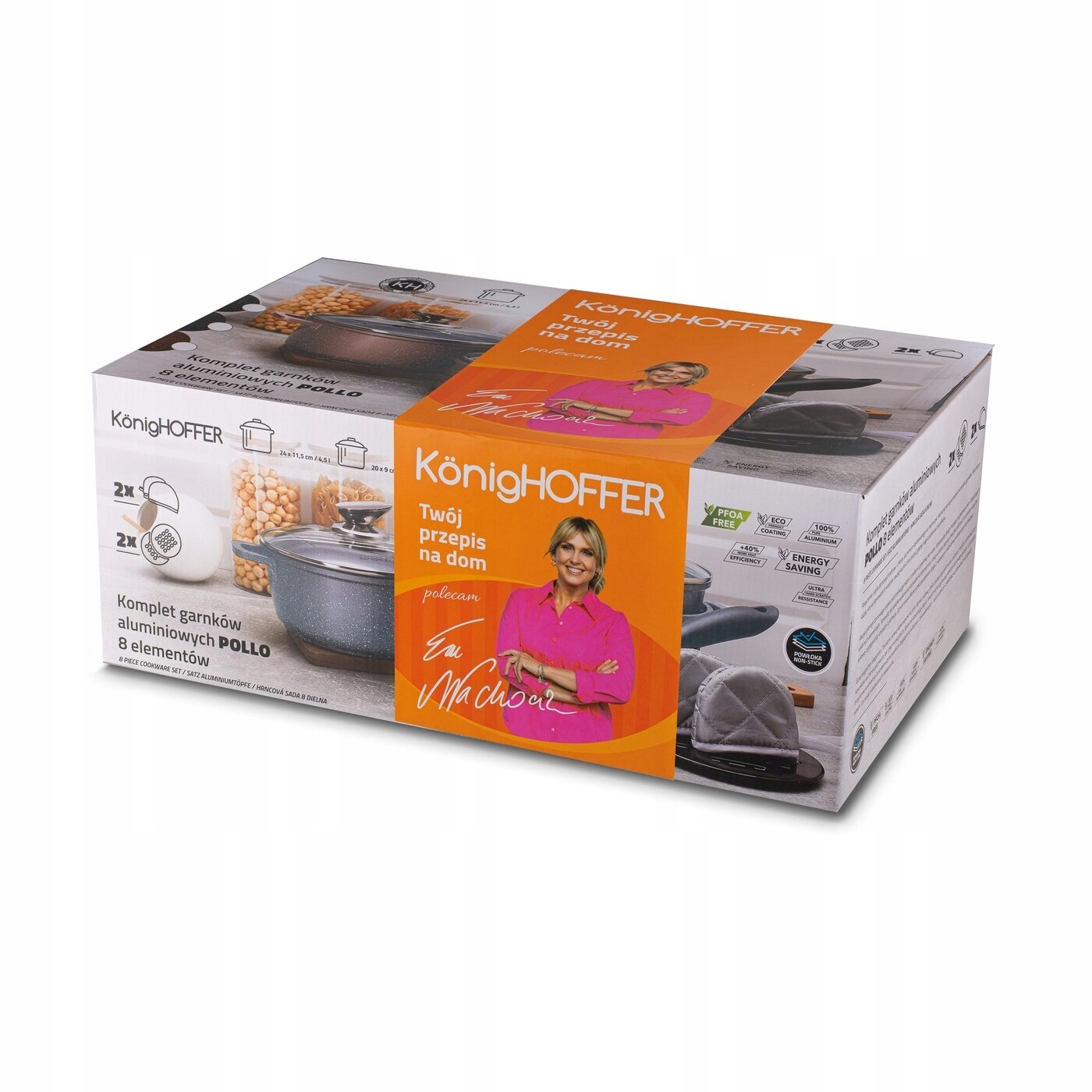 Набір мармурових каструль Konighoffer Pollo Rose Gold із 8 предметів має 2 тканинні кришки для ручок. Набір дозволяє безпечно готувати і смажити, знижуючи ризик обпалити руки. У набір входять посудини об'ємом від 1,2 до 4,5 л. Каструлі та каструлі оснащені скляними кришками зі сталевим бортиком для захисту від сколів. Вони також мають стильні ручки з нержавіючої сталі. З набором кам’яних каструль Pollo ви можете готувати на будь-якій плиті. Гранітне антипригарне покриття та мармурове оздоблення алюмінієвих корпусів додають його елегантності. Вони швидко нагріваються, тому ви заощадите час і енергію. Ідеально підійдуть для сімейної кухні або на подарунок. Вони також добре захищені від високих температур і рівномірно проводять тепло. У вас також є можливість використовувати каструлі (не каструлі!) у духовці при максимальній температурі 220 градусів C. Їх безпечне використання та нетоксичний дизайн для навколишнього середовища позначені маркуванням «Free PFOA Free». Щоб не пошкодити стіл або кухонну стільницю, просто використовуйте 2 підкладки для гарячого посуду, що входять в комплект. Ручка каструлі оброблена м'яким на дотик матеріалом. Завдяки цьому він не ковзає в руці і не нагрівається, а також приємний на дотик. Продукт рекомендований Ewa Wachowicz. Як амбасадор бренду Konighoffer, вона тепло та з усмішкою рекомендує його для домашнього використання. Разом з ним ви отримаєте свій рецепт для дому. Це один з найкращих варіантів у цій категорії!