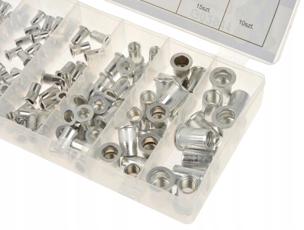 Набір алюмінієвих заклепок М3-М10. Фланець циліндричний, рифлений, завдяки чому він більш щільно прилягає до кріпиться елементу. Заклепкові гайки дають змогу вкручувати гвинт або гвинт із метричною різьбою в листовий метал або інші матеріали, де різьблення неможливе.