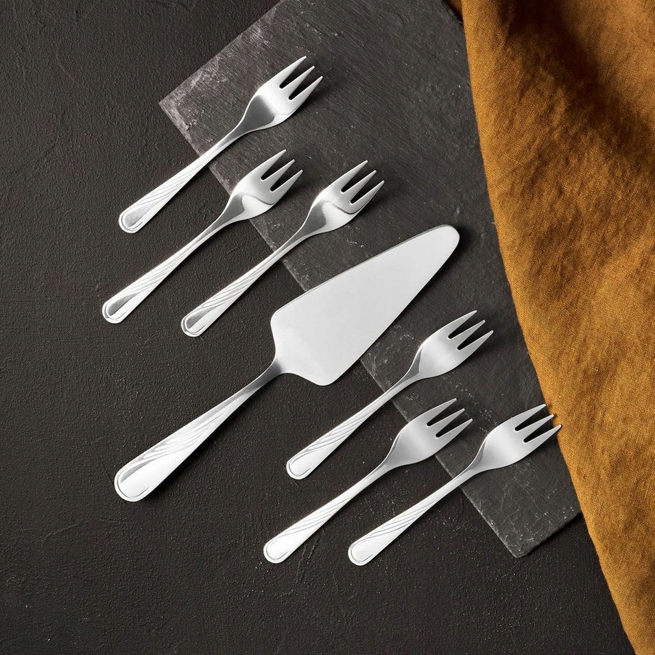 Наполі в класичній формі, прикрашений тонким мотивом лінії. Тістові вилки виготовлені з високої якості нержавіючої сталі, відшліфованої вручну.