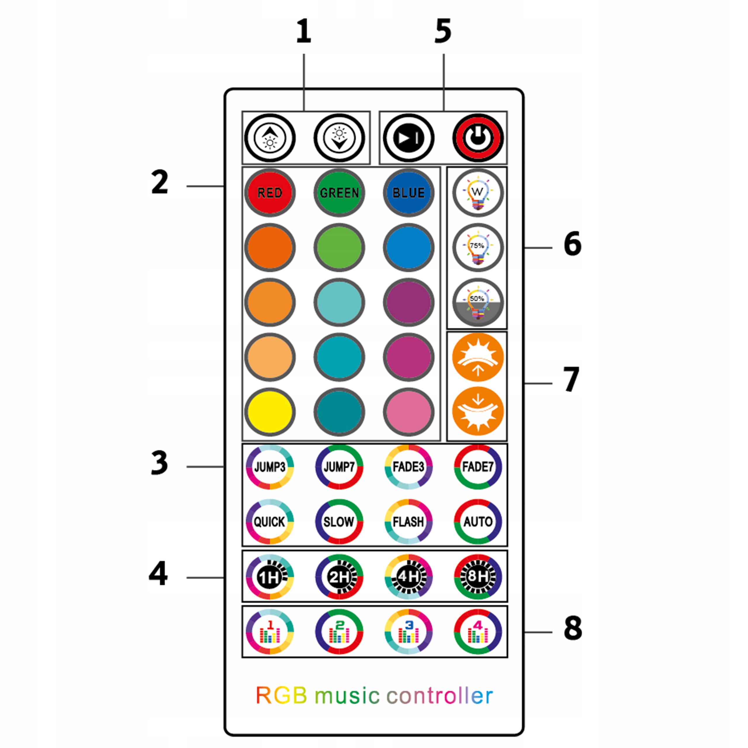 Ми можемо встановити синхронізацію з музикою, швидкість зміни кольору та багато іншогопідсвічування готових режимів роботи, таймер (встановлення, коли стрічка має вмикатися чи вимикатися),