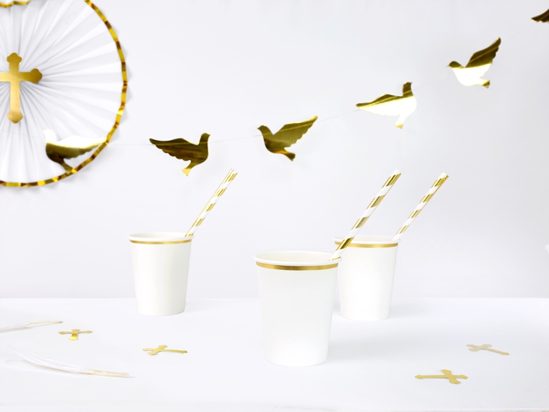 Тарілки з білого паперу із золотистими краями — це фантастичний гаджет, ідеальний для святкування дня народження, причастя чи хрещення.