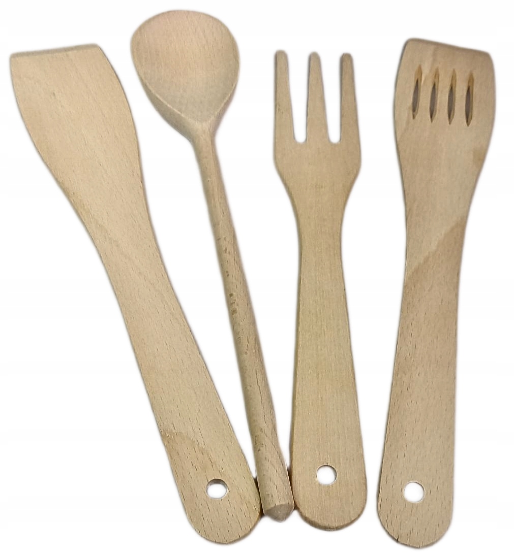 ДЕРЕВ'ЯНИЙ КУХОННИЙ ПОСУД - НАБІР З 4 ЕЛЕМЕНТІВ - ЗВИЧАЙНА лопатка, ажурна лопатка, ложка, виделка