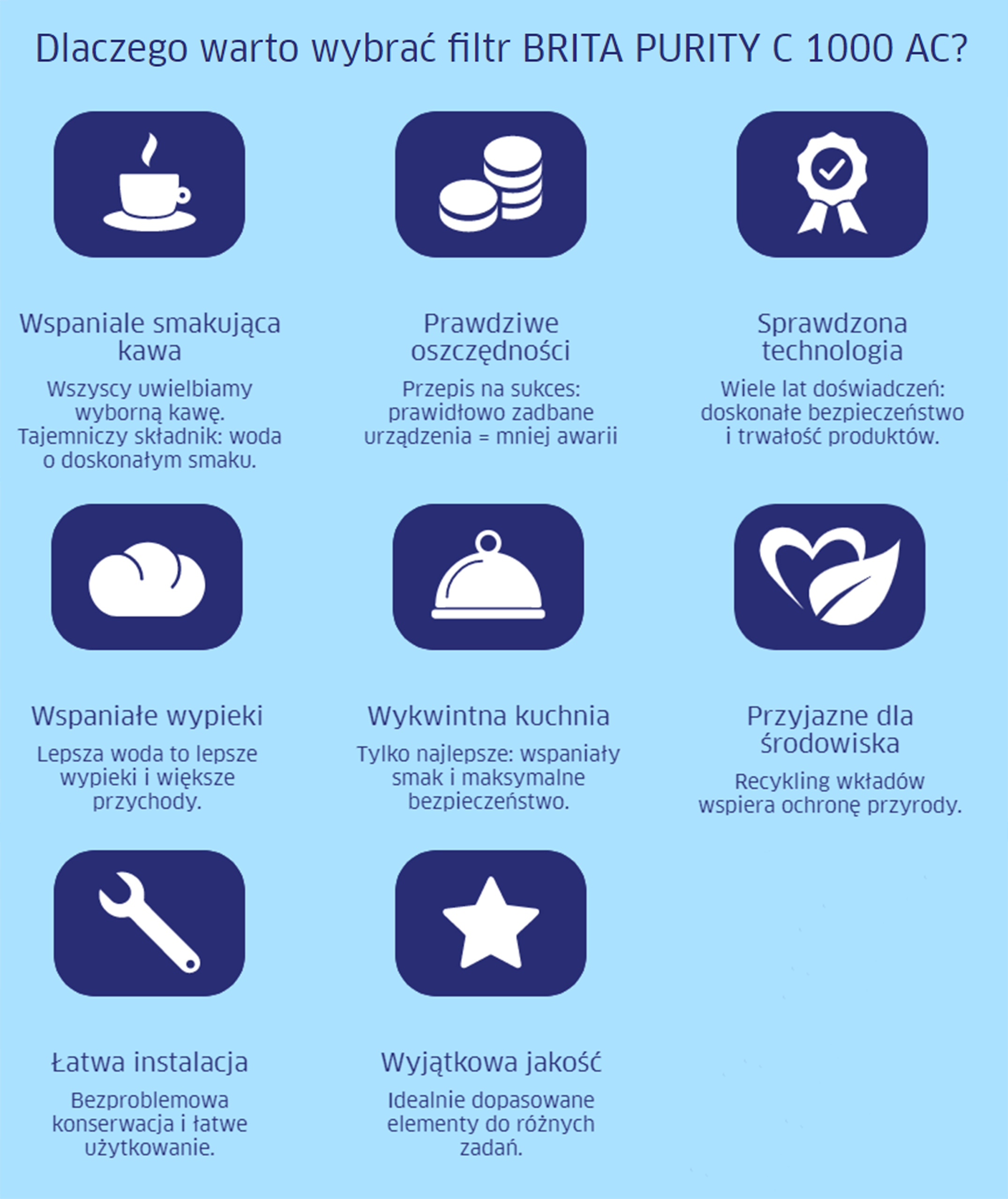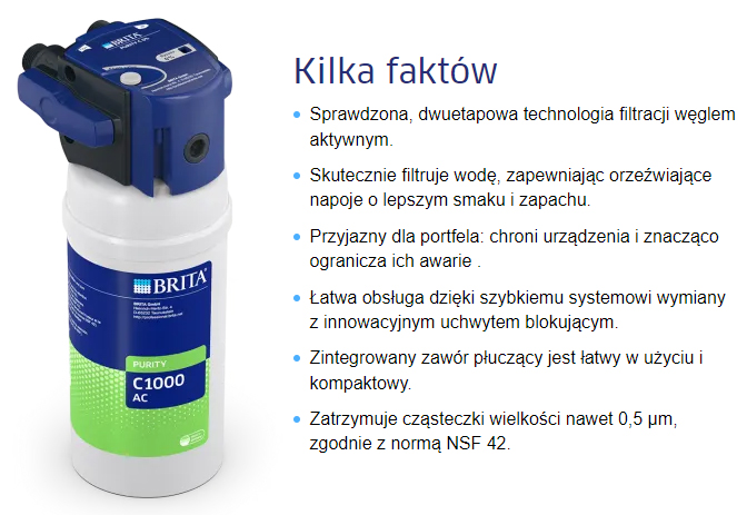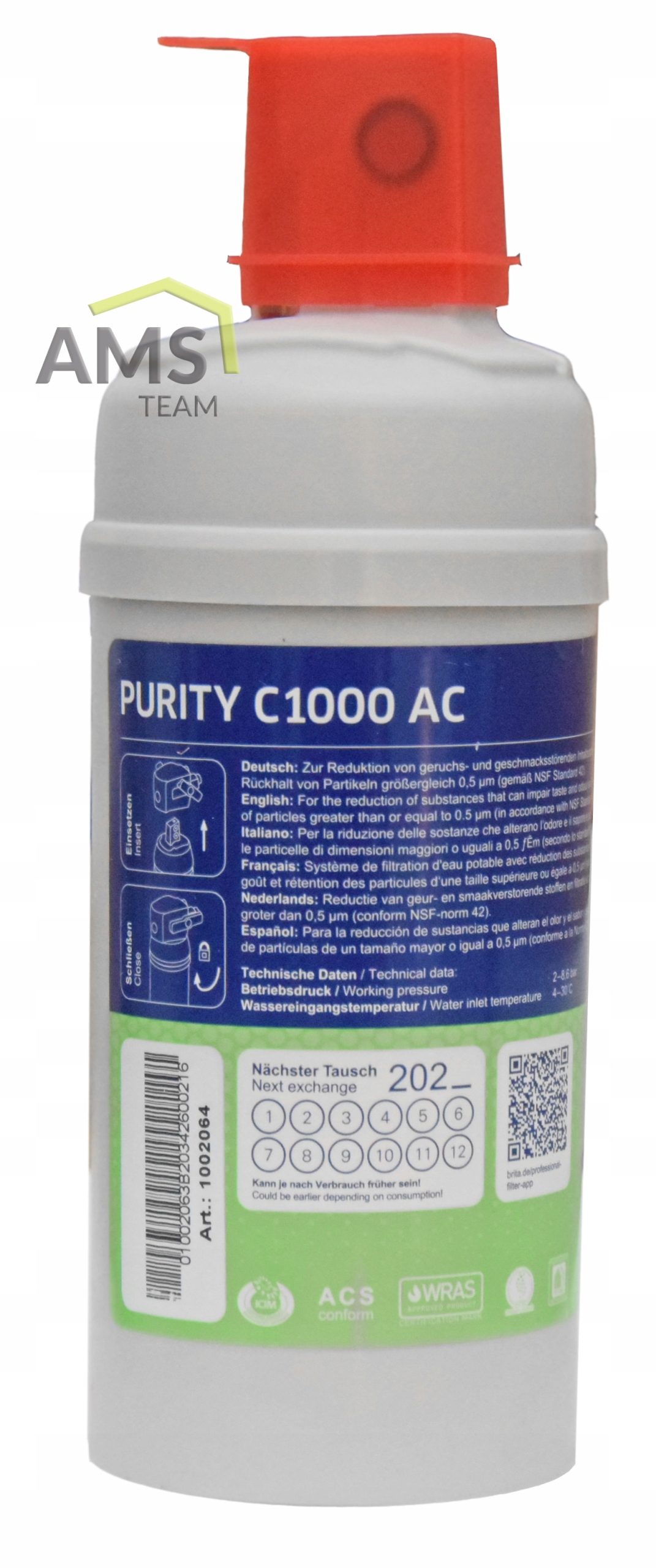 PURITY C1000 AC, що містить блок активованого вугілля, ефективно утримує речовини, що містяться в питній воді, які можуть негативно вплинути на смак, запах або зовнішній вигляд кінцевого продукту.