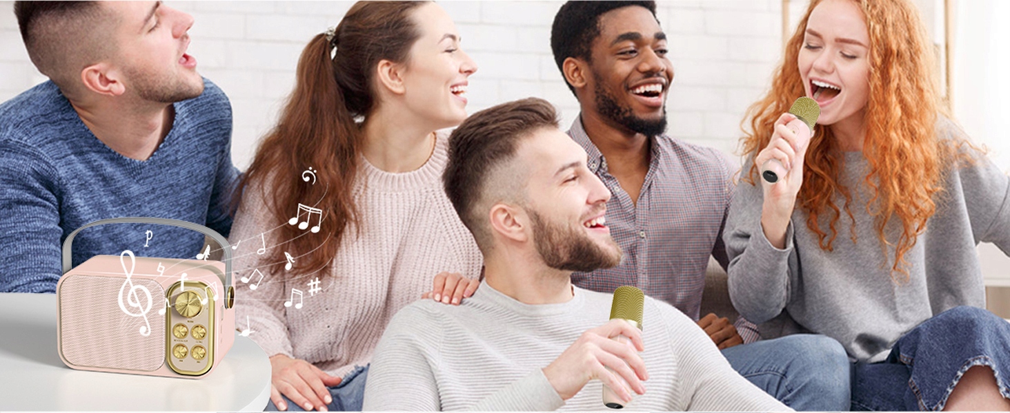 Ця міні-система караоке оснащена 2 мікрофонами та 7 голосовими ефектами, включаючи режим караоке, режим оригінального звуку, режим відлуння, режим чоловічого голосу, режим жіночого голосу, режим дитячого голосу і магічний голосовий режим.