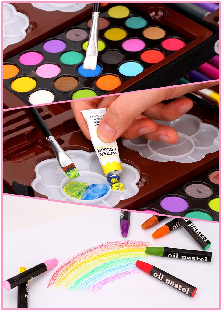 Набір для малювання та малювання поміщений у спеціальний футляр - алюмінієву валізу. Має рельєфні відділення для кольорових олівців, фломастерів, фарб і аксесуарів. Валіза складається з чотирьох частин - бічні - це підняті полиці, що забезпечують кращий доступ до вмісту.
