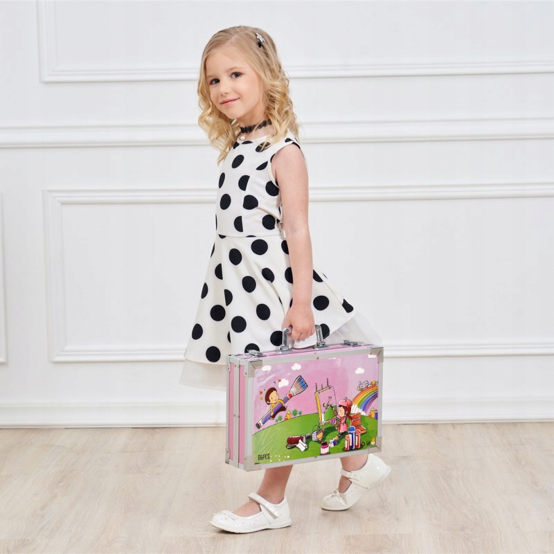 Великий набір для малювання та малювання. Він складається зі 145 елементів, розміщених в естетичній валізі. Крім того, алюмінієва конструкція забезпечує безпечне зберігання і дозволяє дитині зручно транспортувати набір і встановлювати його в обраному місці. Завдяки валізі кожен елемент має своє місце, що дозволяє завжди підтримувати порядок.