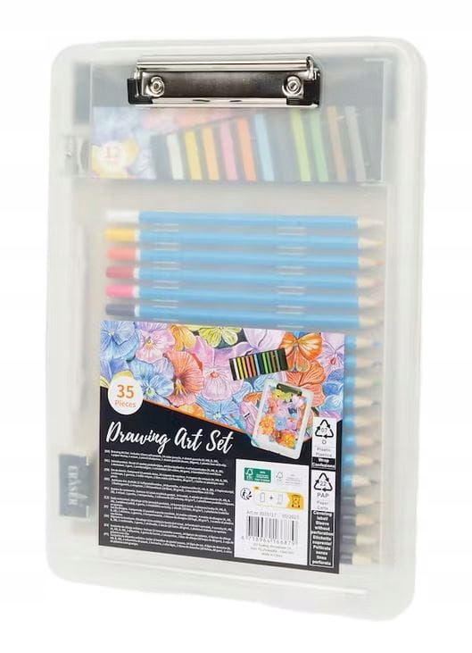 Включає 12 м’яких пастельних олівців, 14 кольорових олівців, 4 олівці для малювання, 1 шліфувальну машинку, 1 ластик, 1 точилку, 1 блокнот для малювання та 1 пластикову коробку із затискачем.