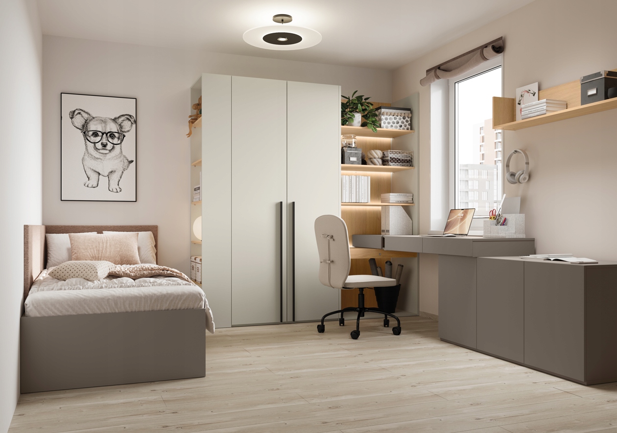 Завдяки цікавому поєднанню універсальних кольорів ця система чудово підійде як для кімнат дівчаток, так і для хлопчиків, створюючи гармонійні композиції в скандинавському, мінімалістичному та молодіжному міському стилі.