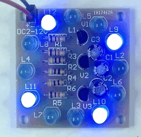 Діоди ритмічно світяться групами по чотири, створюючи враження обертання.