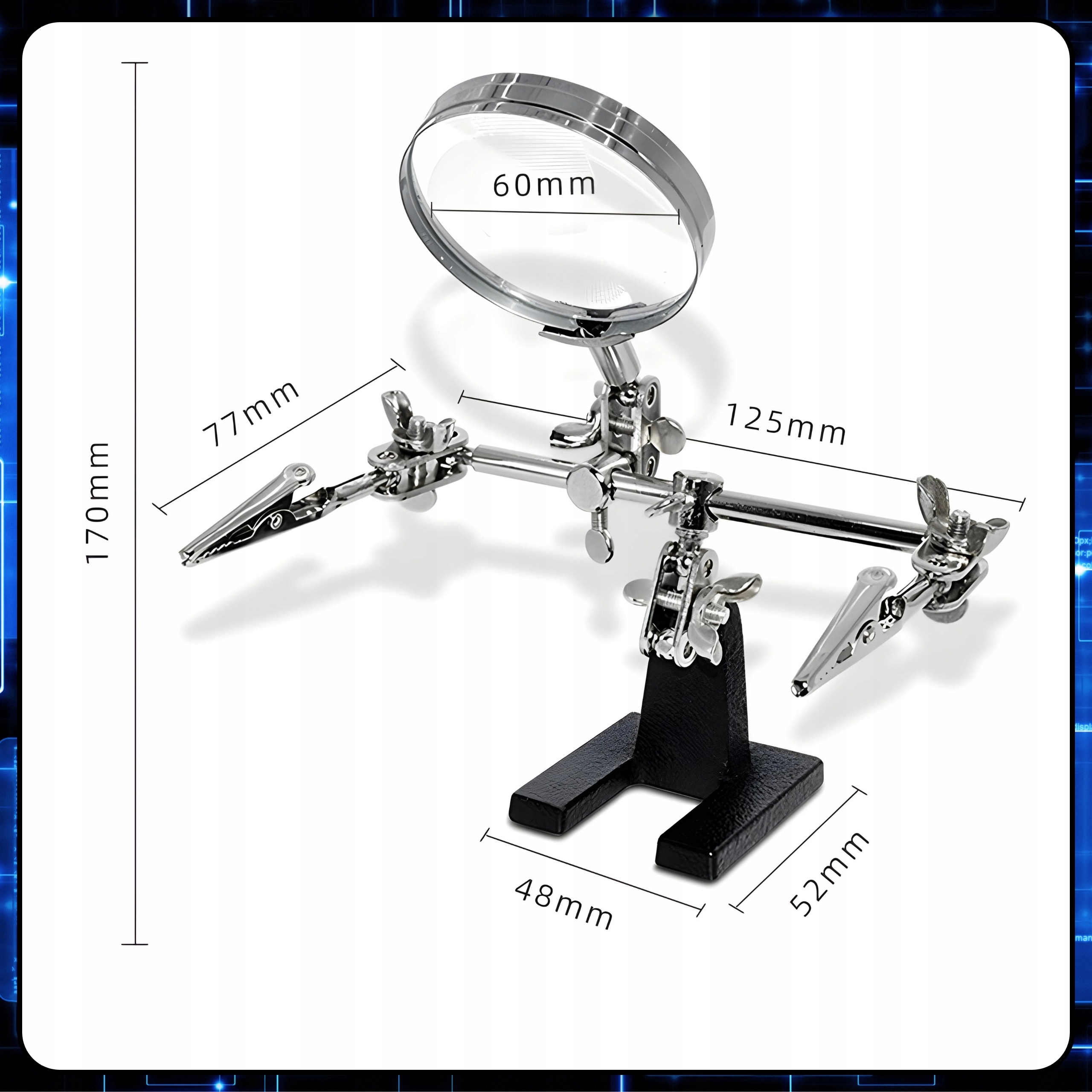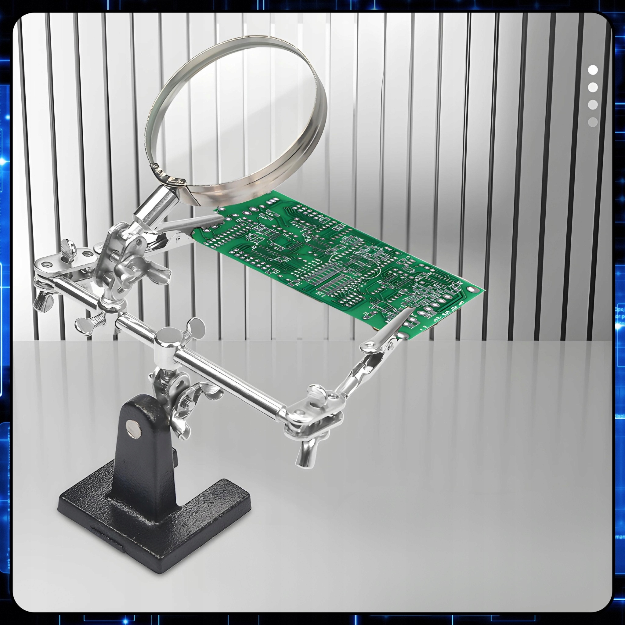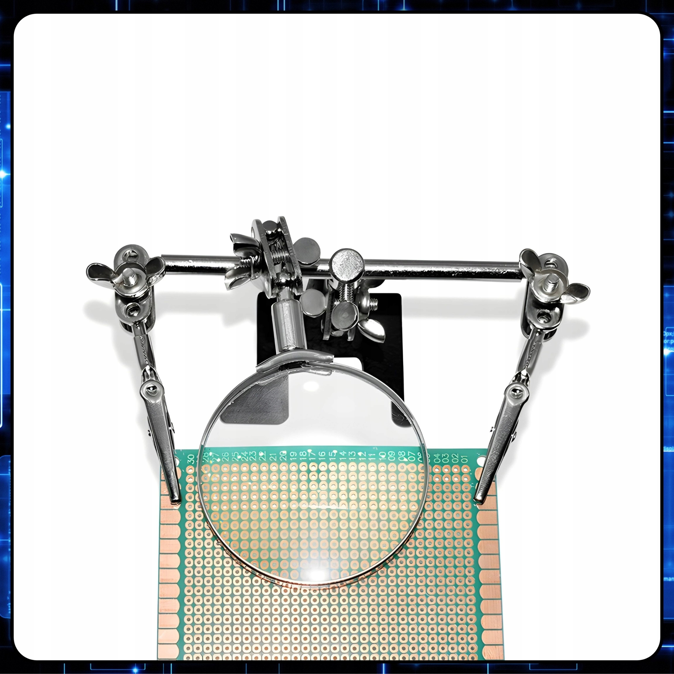 - Конструкція набору «Третя рука» повністю регулюється, що дозволяє адаптувати інструмент до ваших індивідуальних потреб і специфіки проекту. Ви можете вільно встановлювати кут і висота рук, а також положення лупи, що забезпечує максимальний комфорт і ергономічність роботи. Регулювання дозволяє адаптувати інструмент до різних розмірів і форм елементів, що робить набір надзвичайно універсальним. Завдяки легкому регулюванню інструмент ідеально підходить для широкого діапазону застосувань, від пайки та склеювання до складання та перевірки. Ця гнучкість робить набір надзвичайно практичним і універсальним інструментом у кожній майстерні.