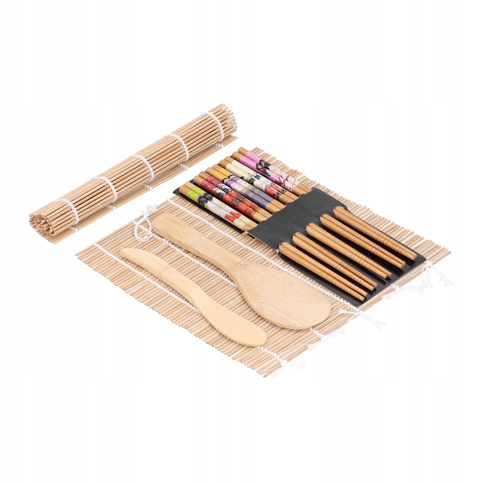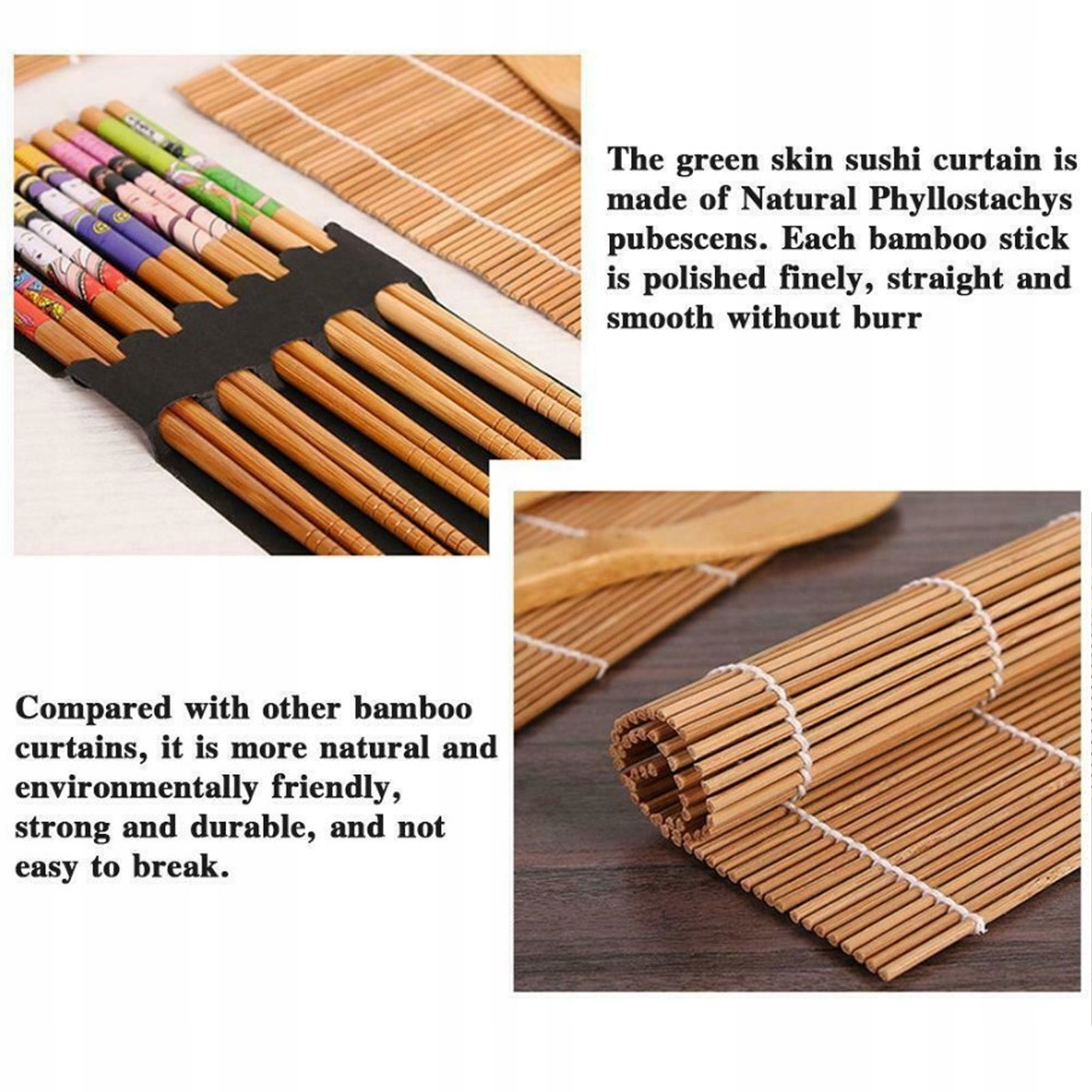 5. У набір входить 5 пар паличок для їжі, 2 фіранки для суші, 1 бамбукова лопатка та 1 бамбукова ложка для рису.